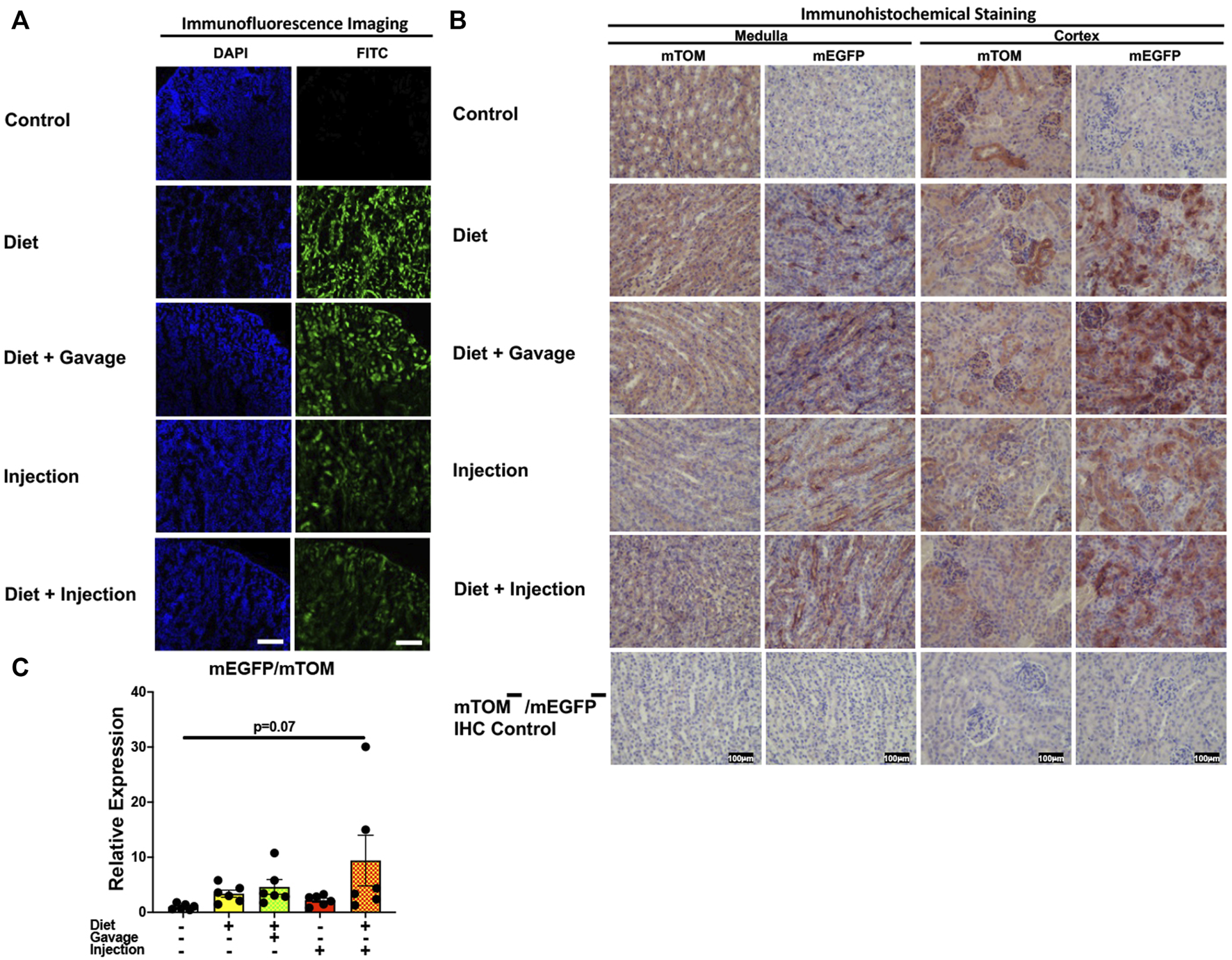 FIGURE 9. Inducible Cre-mediated expression of membrane-localized enhanced GFP (mEGFP) in the kidney: (A) Representative photomicrographs of fixed kidney sections of R26Cre−ERT2/mTOM-mEGFP mice subjected to different TAM-dosing regimens: TAM-injections (N = 8), TAM-diet (N = 6), TAM-diet plus TAM-injections (N = 8), and TAM-diet plus TAM-oral gavage (N = 6) showing partial mEGFP labeling. Green fluorescence was not evident in the kidney of control mice fed a regular chow diet (N = 4). Scale bars: 170 µm. (B) Representative immunohistochemical photomicrographs of kidney medulla and cortex of R26Cre−ERT2/mTOM-mEGFP mice subjected to different TAM-dosing regimens: TAM-diet (N = 5), TAM-diet plus TAM-oral gavage (N = 5), TAM-injections (N = 5), and TAM-diet plus TAM-injections (N = 5) showing complete mEGFP labeling. Widespread mTOM labeling was detected in the kidney of regular chow diet-fed control mice (N = 5). The mTOM−/mEGFP− mice (N = 4) lacking reporter transgene were included as IHC controls to ascertain the absence of mTOM or mEGFP staining. (C) Quantitative real-time RT-PCR showing the relative expression of mEGFP/mTOM in kidney homogenate from the four TAM treatments and control groups. Statistical analysis was performed by one-ANOVA followed by Tukey’s multiple-comparison post hoc test. N = 5–6.