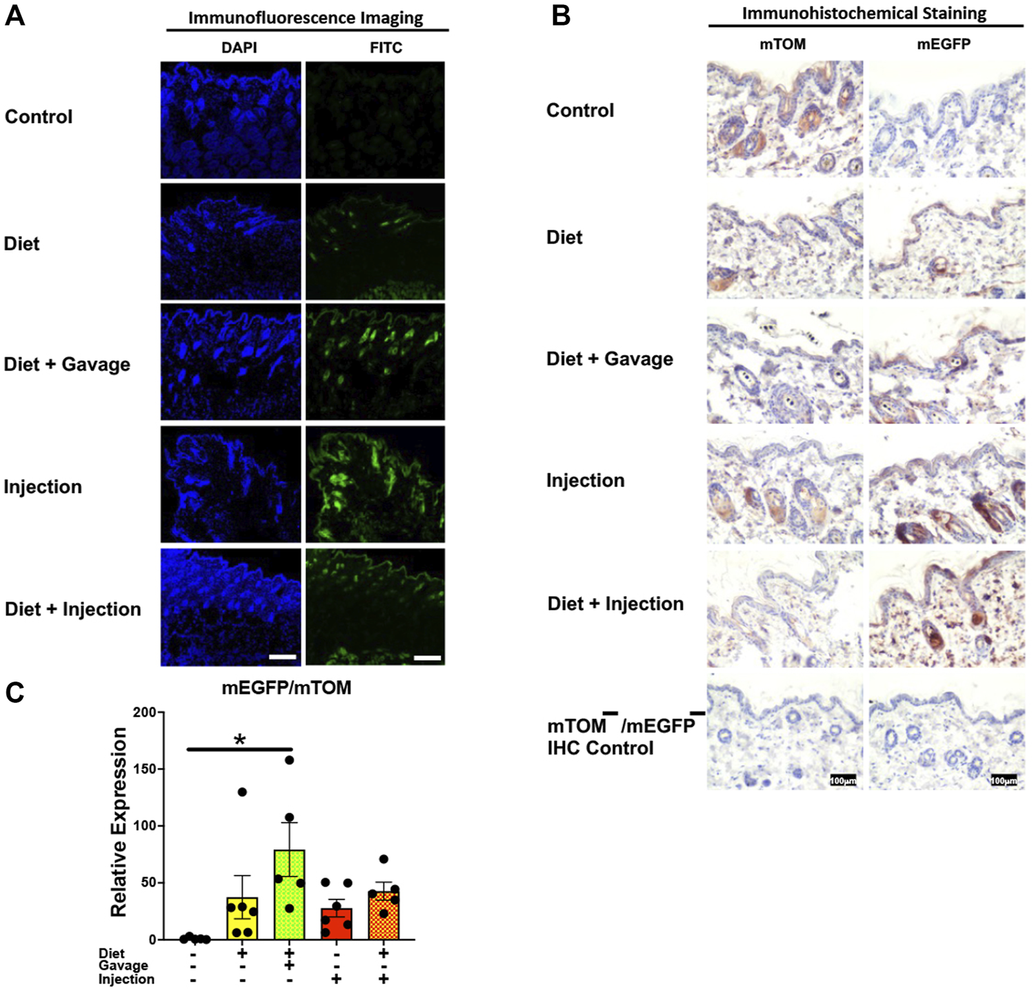 FIGURE 10. Inducible Cre-mediated expression of membrane-localized enhanced GFP (mEGFP) in the skin. (A) Representative photomicrographs of fixed skin sections of R26Cre−ERT2/mTOM-mEGFP mice subjected to different TAM-dosing regimens: TAM-injections (N = 4), TAM-diet (N = 6), TAM-diet plus TAM-injections (N = 5), and TAM-diet plus TAM-oral gavage (N = 4) showing variable mEGFP labeling. Green fluorescence was not evident in the skin of control mice fed a regular chow diet (N = 3). Scale bars: 170 µm. (B) Representative immunohistochemical photomicrographs of skin sections of R26Cre−ERT2/mTOM-mEGFP mice subjected to different TAM-dosing regimens: TAM-diet (N = 5), TAM-diet plus TAM-oral gavage (N = 5), TAM-injections (N = 5), and TAM-diet plus TAM-injections (N = 5) showing variable mEGFP labeling in the epidermis and hair follicles. Widespread mTOM labeling was detected in the skin of regular chow diet-fed control mice (N = 5). The mTOM−/mEGFP− mice (N = 4) lacking reporter transgene were included as IHC controls to ascertain the absence of mTOM or mEGFP staining. (C) Quantitative real-time RT-PCR showing the relative expression of mEGFP/mTOM in skin homogenate from the four TAM treatments and control groups. Statistical analysis was performed by one-ANOVA followed by Tukey’s multiple-comparison post hoc test. Data are represented as mean ± SEM. *p < 0.05. N = 5–6.