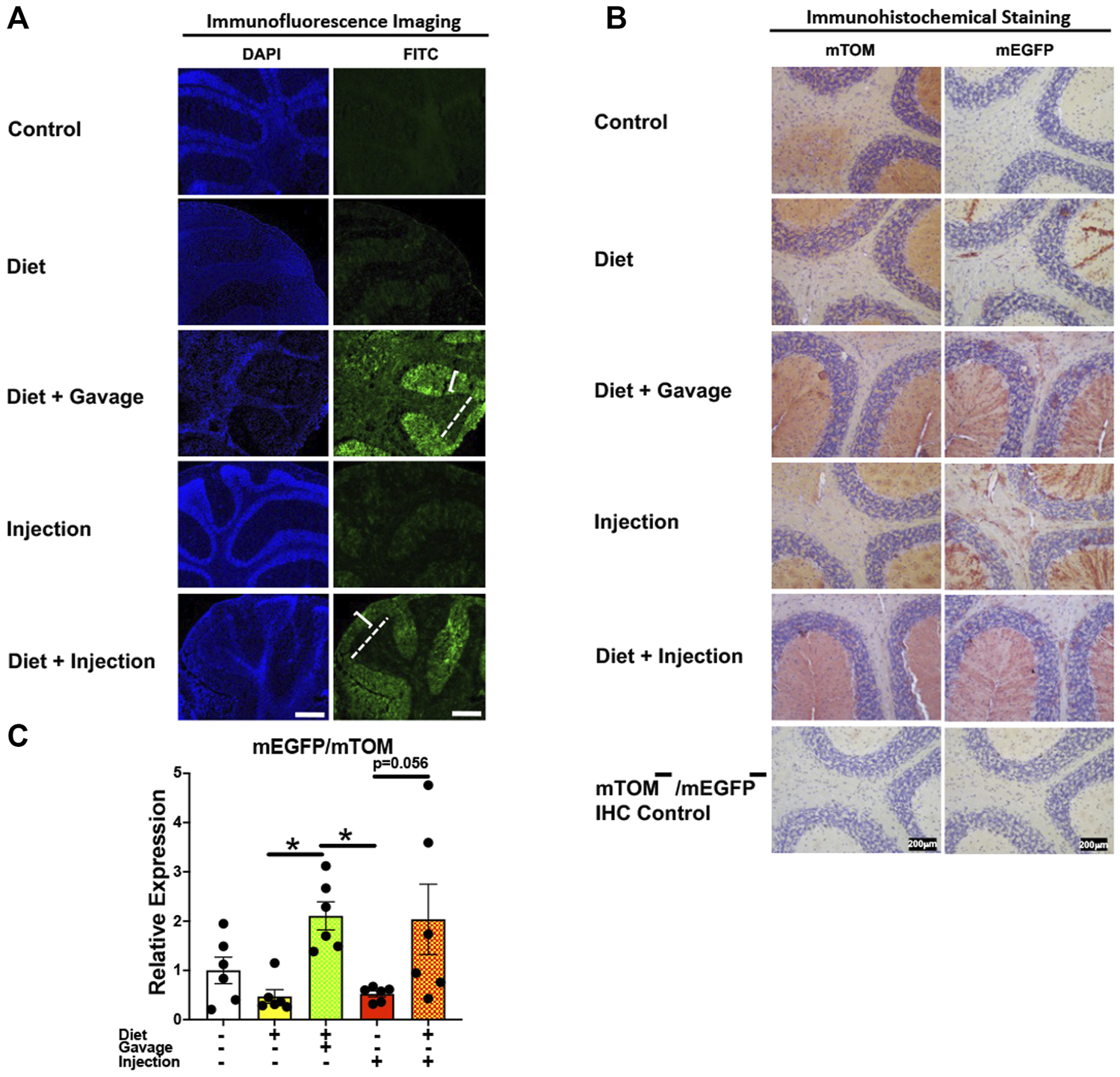 FIGURE 11. Inducible Cre-mediated expression of membrane-localized enhanced GFP (mEGFP) in the brain (cerebellum). (A) Representative photomicrographs of fixed brain sections of R26Cre−ERT2/mTOM-mEGFP mice subjected to different TAM-dosing regimens: TAM-injections (N = 6), TAM-diet (N = 6), TAM-diet plus TAM-injections (N = 5), and TAM-diet plus TAM-oral gavage (N = 6) showing variable mEGFP labeling in the cerebellum. Green fluorescence was not evident in the brain of control mice fed a regular chow diet (N = 3). The bracket and dashed lines depict the molecular and granular layers of the cerebellum, respectively. Scale bars: 430 µm. (B) Representative immunohistochemical photomicrographs of brain sections of R26Cre−ERT2/mTOM-mEGFP mice subjected to different TAM-dosing regimens: TAM-diet (N = 5), TAM-diet plus TAM-oral gavage (N = 5), TAM-injections (N = 5), and TAM-diet plus TAM-injections (N = 5) showing variable mEGFP labeling in the cerebellum. Widespread mTOM labeling was detected in the brain of regular chow diet-fed control mice (N = 5). The mTOM−/mEGFP− mice (N = 4) lacking reporter transgene were included as IHC controls to ascertain the absence of mTOM or mEGFP staining. (C) Quantitative real-time RT-PCR showing the relative expression of mEGFP/mTOM in brain homogenate from the four TAM treatments and control groups. Statistical analysis was performed by one-ANOVA followed by Tukey’s multiple-comparison post hoc test. Data are represented as mean ± SEM. *p < 0.05. N = 6.
