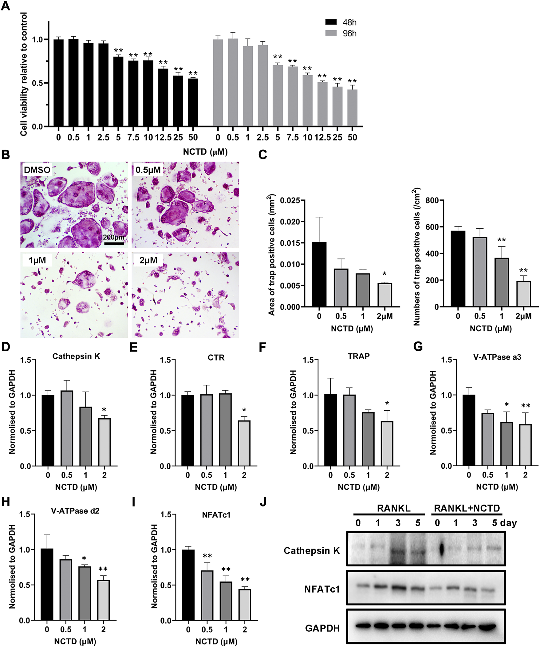 NCTD affected osteoclast formation in BMM in a non-toxic range. (A) After adding gradient concentration of NCTD into BMM cell culture, CCK8 kit was used to detect the cell viability to figure out the non-toxic range of NCTD for BMM (n = 5). (B) BMM cells were induced into osteoclasts with cytokines M-CSF and RANKL, and DMSO/NCTD was added to observe the effect of NCTD on osteoclastogenesis. (C) The area and number of osteoclasts induced by BMM were quantified. (D–I) After BMM was treated with different concentrations of NCTD, the osteoclast makers of Cathepsin K, CTR, TRAP, V-ATPase a3, V-ATPase d2, and NFAT c1 were detected by fluorescence quantitative PCR. (J) Western blotting was used to investigate the effects of NCTD addition on Cathepsin K and NFATc1 during osteoclast formation. All experiments were repeated independently for three times. Values are expressed as mean ± SD; *p < 0.05, **p < 0.01 vs. the control group.