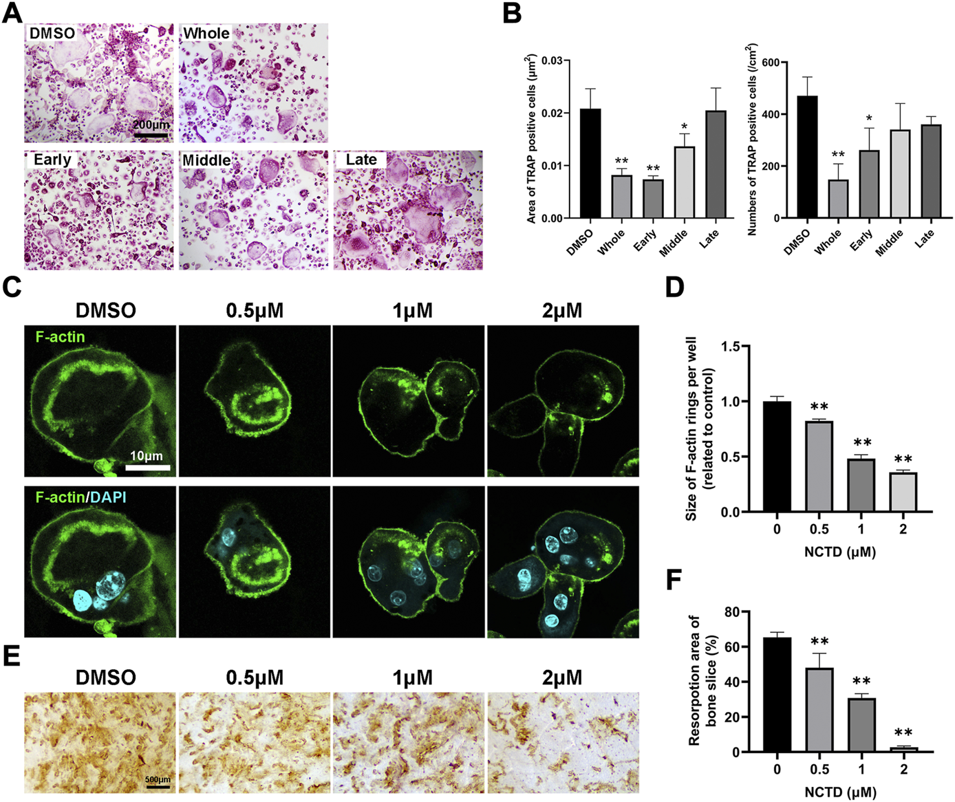 NCTD inhibited the formation of F-actin rings in osteoclasts and inhibited bone resorption. (A) The effects of NCTD treatment at different time periods (Early stage, middle stage and late stage) on osteoclast formation were observed with the light microscope. (B) The areas and numbers of osteoclasts in BMM cells treated by NCTD at different stages were quantified. (C) BMM was induced into osteoclasts on bone slices. After treatment with different concentrations of drugs, FITC-Phalloidin and DAPI staining were performed and observed by fluorescence microscope. (D) While observing the F-actin ring in the process of BMM inducing osteoclast, the size of F-actin ring was quantified. (E,F) BMM was induced into osteoclasts on bone slices, and the effect of different concentrations of NCTD on bone resorption was observed. Furtherly, the results of bone resorption were further quantified. All experiments were repeated independently for three times. Values are expressed as mean ± SD; *p < 0.05, **p < 0.01 vs. the control group.