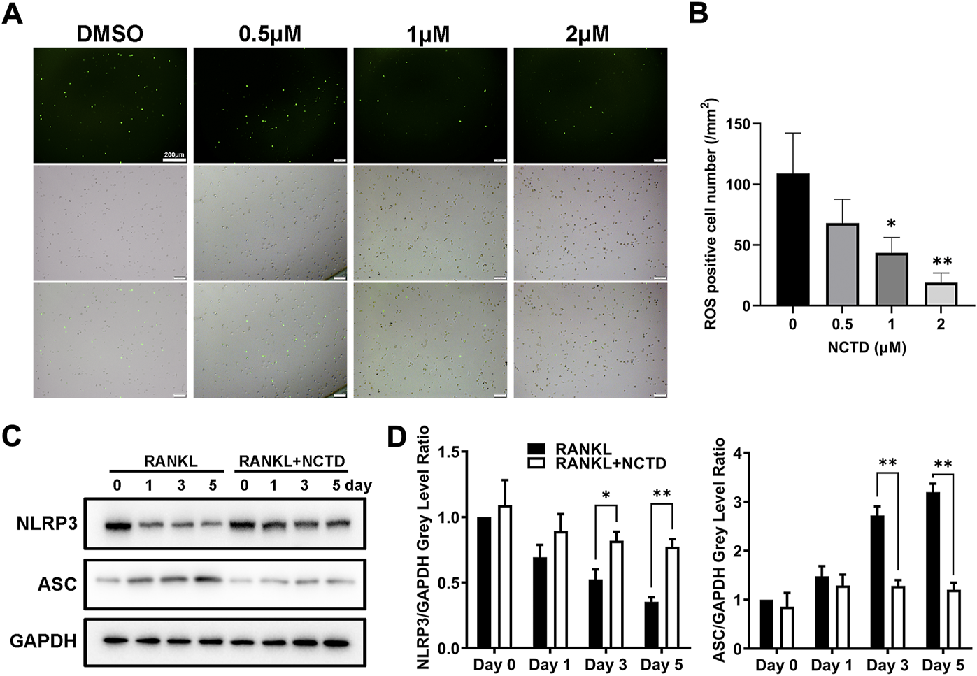 NCTD reduced the content of ROS and inhibited the formation of inflammasome in BMM cells. (A) During BMM differentiating into osteoclast with RANKL, ROS kit was used to detect the ROS content in BMM. (B) The ROS observed under fluorescence microscope was quantified. (C) Western blotting was used to measure NLRP3 and ASC expression level in BMM induced osteoclasts at day 0, 1, 3, and 5. (D) The NLRP3 and ASC bands of Western blotting were quantified. All experiments were repeated independently for three times. Values are expressed as mean ± SD; *p < 0.05, **p < 0.01 vs. the control group.
