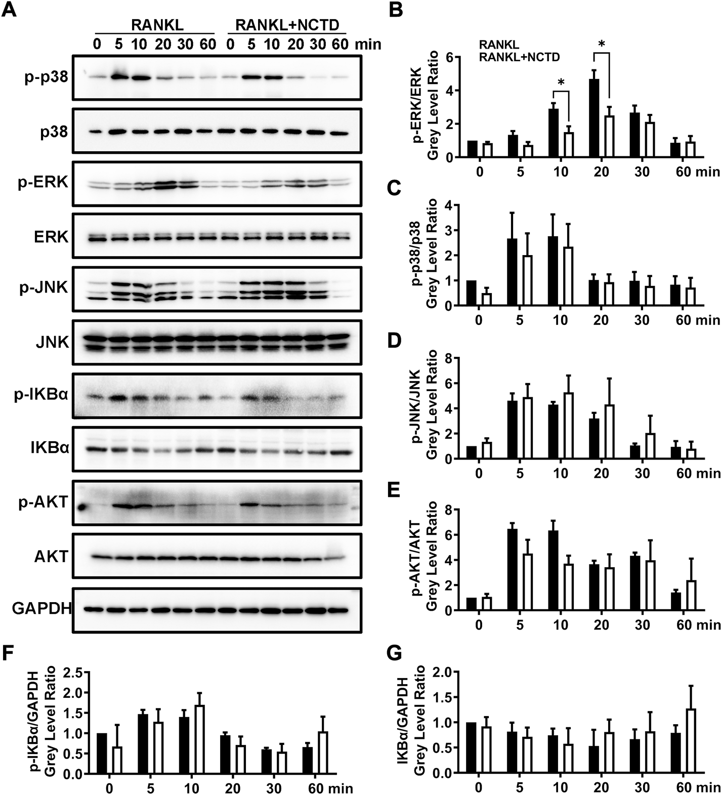 NCTD can downregulate the expression of ERK in BMM cells during osteoclast formation. (A) Western blotting was used to measure p-p38, p38, p-ERK, ERK, p-JNK, JNK, p-IKBα, IKBα, p-AKT, AKT and GAPDH expression level on BMMs after RANKL stimulating at 0, 5, 10, 20, 30 and 60 min. (B) The phosphorylation degree of p-ERK can be showed by the p-ERK /ERK gray value ratio in Western blotting. (C) Western blotting bands of P-P38/P38 were quantified. (D) The phosphorylation degree of P-JNK can be showed by the p-JNK/JNK gray value ratio in Western blotting. (E) The phosphorylation degree of P-AKT can be showed by the p-AKT/AKT gray value ratio in Western blotting. (F) The Western blotting bands of P-IKBα/GAPDH were quantified and represented by histograms. (G) The Western blotting bands of IKBα/GAPDH were quantified. All experiments were repeated independently for three times. Values are expressed as mean ± SD; *p < 0.05, **p < 0.01 vs. the control group.