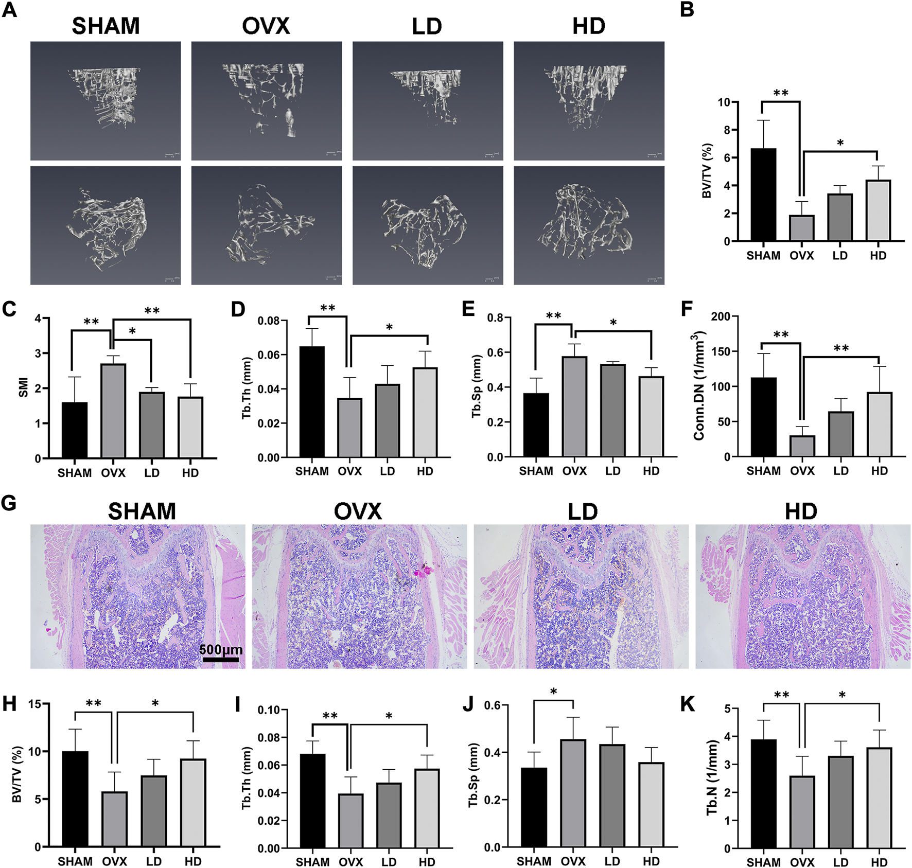 To further explore the role of NCTD in the OVX-induced mouse model of osteoporosis, the femurs of mice were histologically analyzed by H&E staining. H&E staining results showed that the bone trabecular thinning and osteopenia occurred in the mouse femur after OVX, which were improved after NCTD treatment with low (1 mg/kg) and high dose (2.5 mg/kg), and the values of BV/TV, Tb.TH, TB.SP, and TB.N were consistent with the results of micro-CT analysis (Figures 5G–K).