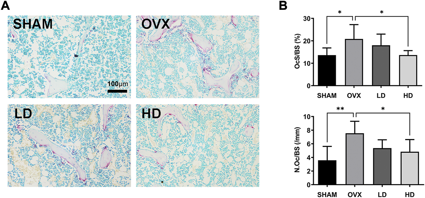 NCTD attenuates osteoclast formation in vivo. (A) The representive images of TRAP staining in each group. (B) The N.Oc/BS and OcS/BS were measured with TRAP-stained sections. in each group. Values are expressed as mean ± SD, n = 5–6; *p < 0.05, **p < 0.01 vs. the control group.