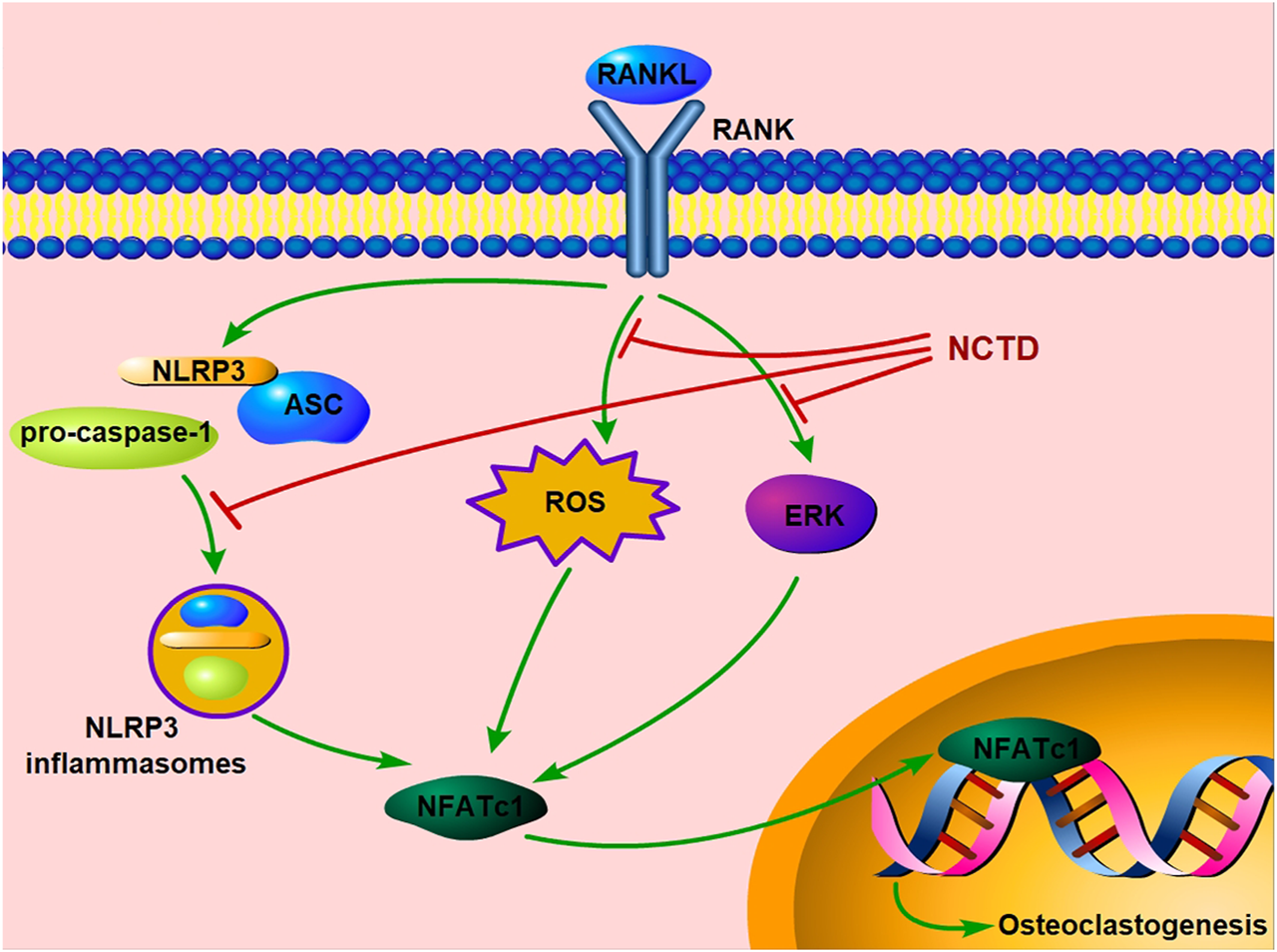 In conclusion, our study exhibited that NCTD could inhibit osteoclast formation and bone resorption by attenuating the ERK, ROS and NLRP3 inflammasomes pathways in vitro. Moreover, our in vivo study further confirms its preventive effects on estrogen-deficiency bone loss by inhibiting osteoclast formation and functions (Figure 7). Therefore, we could conclude that NCTD might be a potential candidate for the prevention and treatment of osteoporosis.