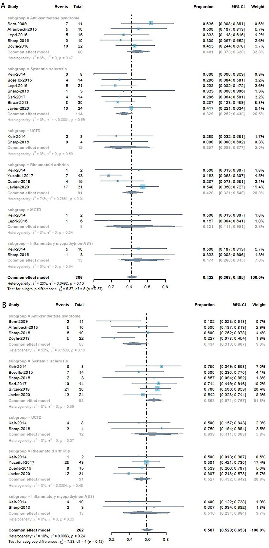Forest plots for the subgroup analyses of studies involving anti-synthetase syndrome (ASS)-ILD, IIM (non-ASS)-ILD, MCTD-ILD, RA-ILD, SSc-ILD, and UCTD-ILD are shown in Figure 3A. ASS-ILD, IIM (non-ASS)-ILD, MCTD-ILD, SSc-ILD and UCTD-ILD were associated with improvement rates of 48.1% (95% CI, 0.373–0.620), 47.4% (95% CI, 0.266–0.845), 33.1% (95% CI, 0.111–0.991), 32.9% (95% CI, 0.252–0.430) and 25.7% (95% CI, 0.098–0.677) respectively, without heterogeneity, except for RA (17% (95% CI, 0.04–0.48), I2 = 74%, p<0.01).
