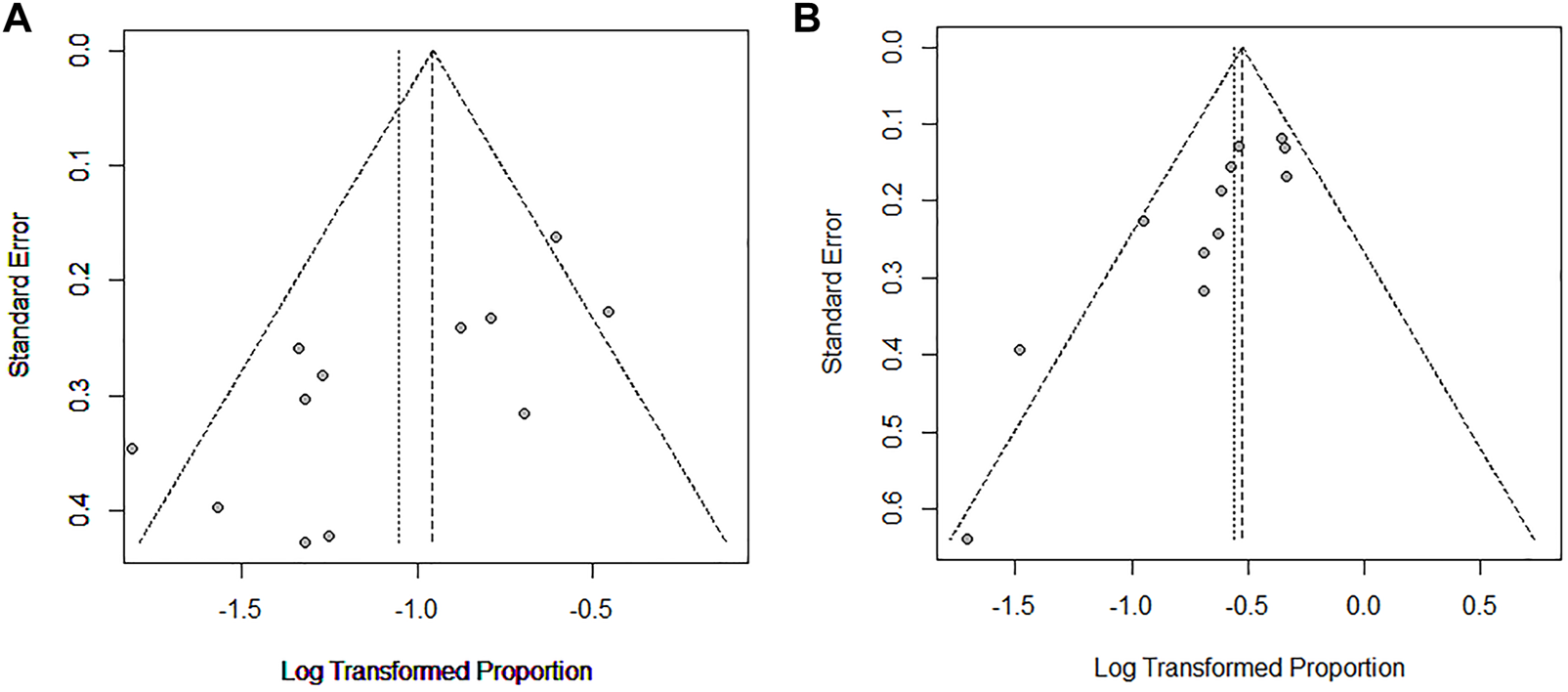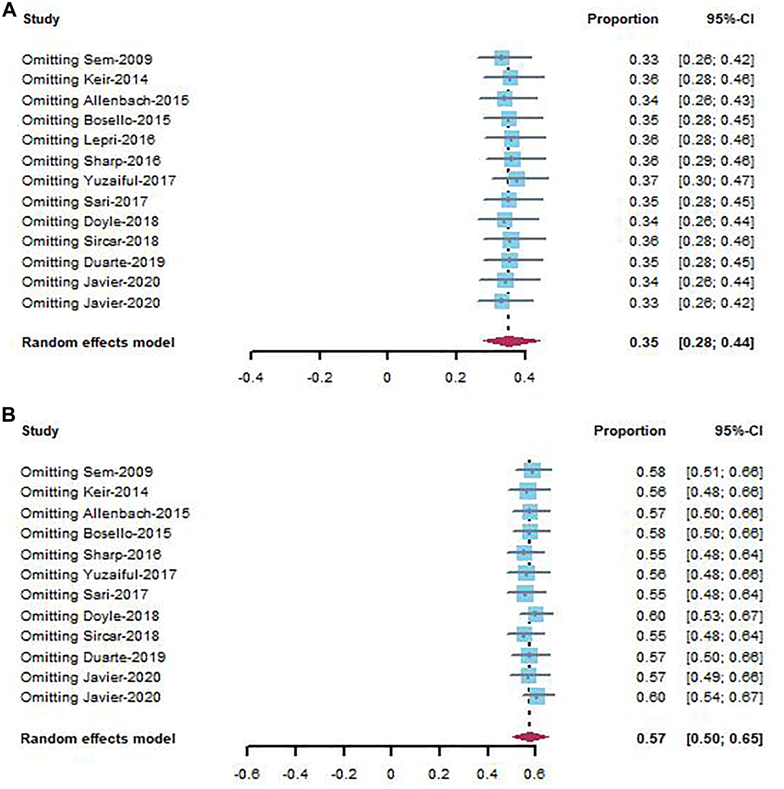 Sensitivity analysis of improvement rate (A) and stable rate (B) in CTD-ILD studies.