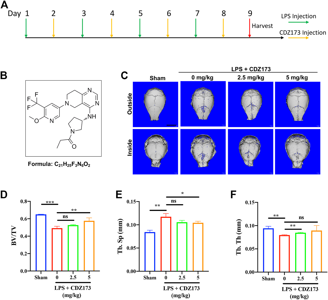 We randomly divided 32 healthy male C57BL/6J mice (6–8 weeks old) into 4 groups, namely the Sham group, LPS group, Low-Dose (2.5 mg/kg) group, and High-Dose (5 mg/kg) group, resulting in 8 mice in each group. After the start of the experiment, LPS was injected subcutaneously via the sagittal line of the skull in LPS group, low-dose (2.5 mg/kg) and high-dose (5 mg/kg) mice on the first, third, fifth and seventh day respectively, with the dose of 5 mg/kg LPS; On the second, fourth, sixth and eighth days, the mice in the low dose group (2.5 mg/kg) and the high dose group (5 mg/kg) were injected 2.5 mg/kg and 5 mg/kg CDZ173 through the sagittal line skin of the skull, respectively. Mice in the Sham group and LPS group were injected with the same amount of normal saline at the same position. Mice were slaughtered after the experiment on the ninth day, and their heads were removed before being preserved in 4% paraformaldehyde for 48 h and analyzed using microcomputed tomography (CT) and tissue sectioning.