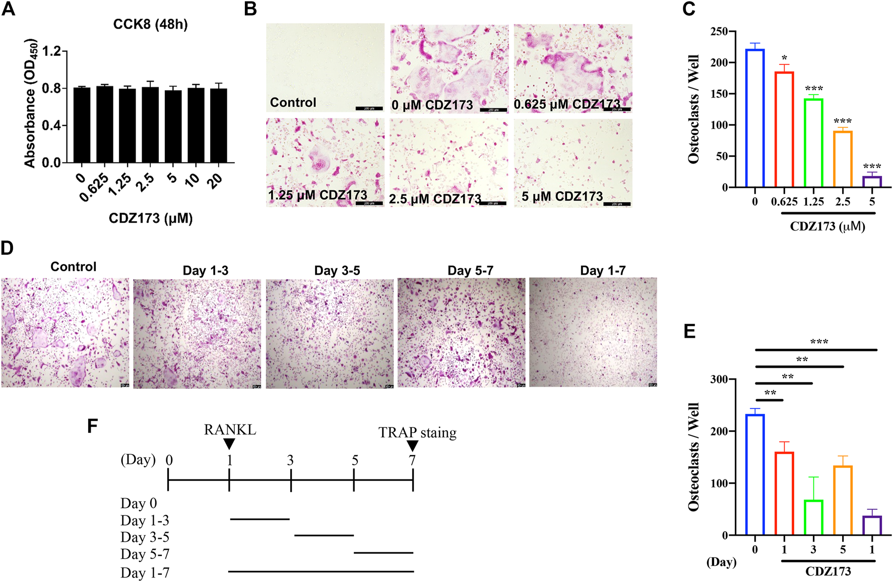 CDZ173 inhibited RANKL-induced osteoclast differentiation and had no toxic effect on BMMs in vitro