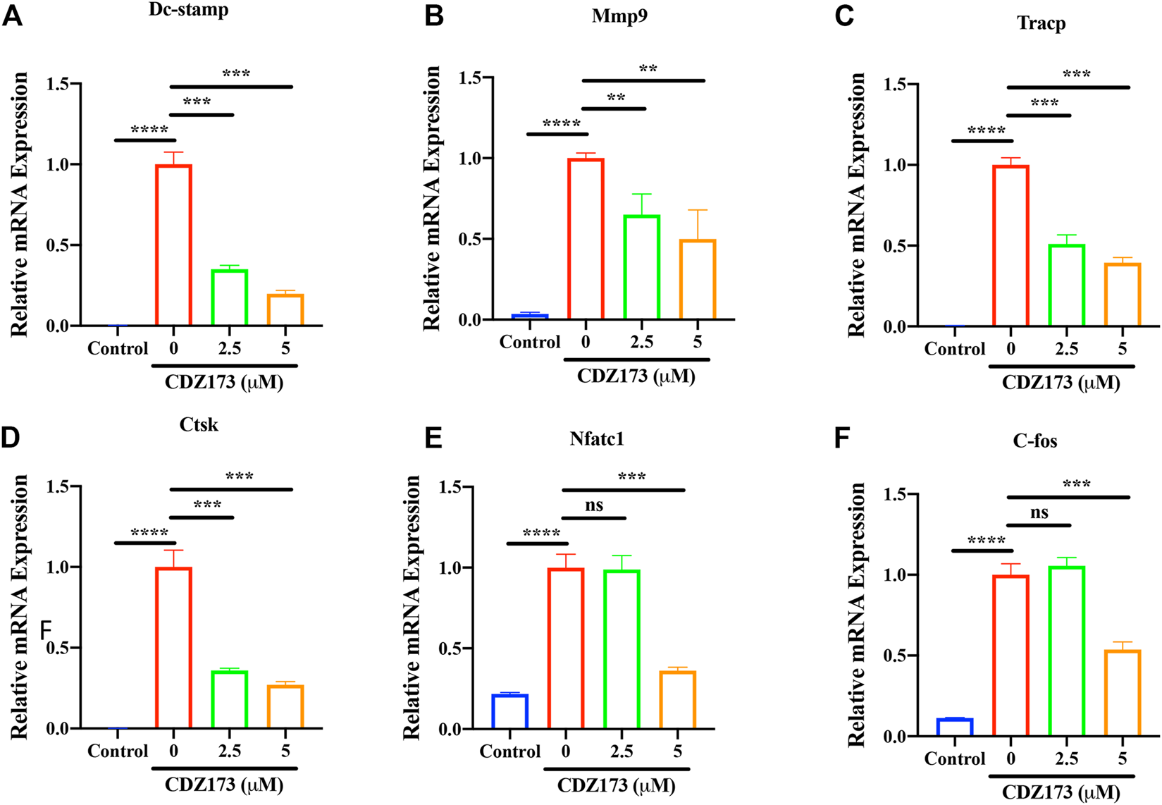FIGURE 5. CDZ173 suppressed RANKL-induced expression of OC-Specific genes. BMMs were stimulated with M-CSF(30 ng/ml), and RANKL (30 ng/ml) in the absence or presence of indicated concentrations of CDZ173 for 5 days to form multinucleated TRAP positive OCs. Specific primers were used to perform real-time PCR for OC related genes (A) Dc-stamp, (B) Mmp-9, (C) Tracp, (D) Ctsk, (E) Nfatc1 and (F) C-fos Gene expression levels of Dc-stamp, Mmp9, Tracp, Ctsk, Nfatc1 and C-fos were expressed relative to control group (**p < 0.01, ***p < 0.001, ****p < 0.0001).