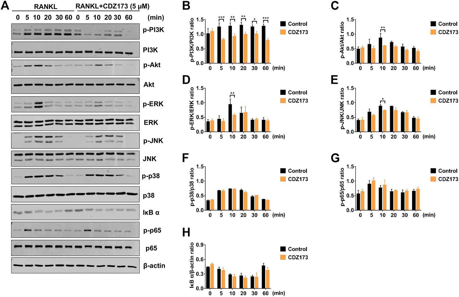 FIGURE 7. CDZ173 suppressed RANKL-induced PI3K-AKT and MAPKs but not NF-κB signaling pathways. (A) BMMs were pretreated for 4 h with or without 5 mM CDZ173, then stimulated for the given durations with RANKL (30 ng/ml). Cells were lysed, total proteins were extracted and subjected to western blot analysis using specific antibodies against p-PI3K, total PI3K p-AKT, total AKT, p-ERK, total ERK, p-JNK, total JNK, p-p38, total p38, p-p65, total p65 and IκBα. Antibody against β-actin was used as internal loading control. The relative densitometry of protein bands for (B) p-PI3K/total PI3K, (C) p-AKT/total AKT, (D) p-ERK/total ERK, (E) p-JNK/total JNK, (F) p-P38/total P38, (G) p-p65/total p65, and (H) IκBα/β-actin were quantified using ImageJ (n = 3). (*p < 0.05, **p < 0.01, ***p < 0.001).