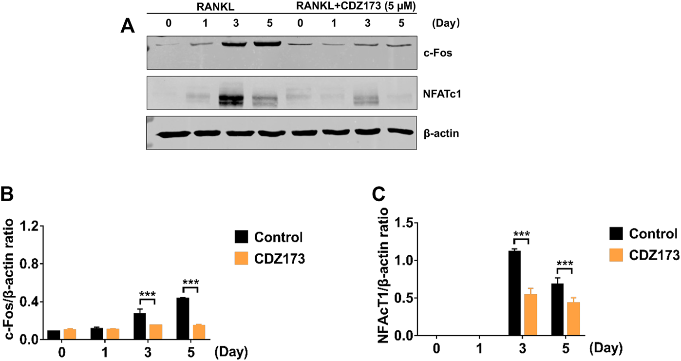 FIGURE 8. CDZ173 inhibited RANKL induced C-fos and NFATc1 transcriptional activity. (A) BMMs cultured with M-CSF(30 ng/ml) and RANKL (30 ng/ml) absence or presence of 5 μM CDZ173 for 1, 3 or 5 days were lysed and total cellular protein extracts were subjected to western blot analysis using specific antibodies to NFATc1, c-Fos and β-actin. The relative densitometry of protein bands for (B) c-Fos and (C) NFATc1 against β-actin were quantified using ImageJ (n = 3) (***p < 0.001).
