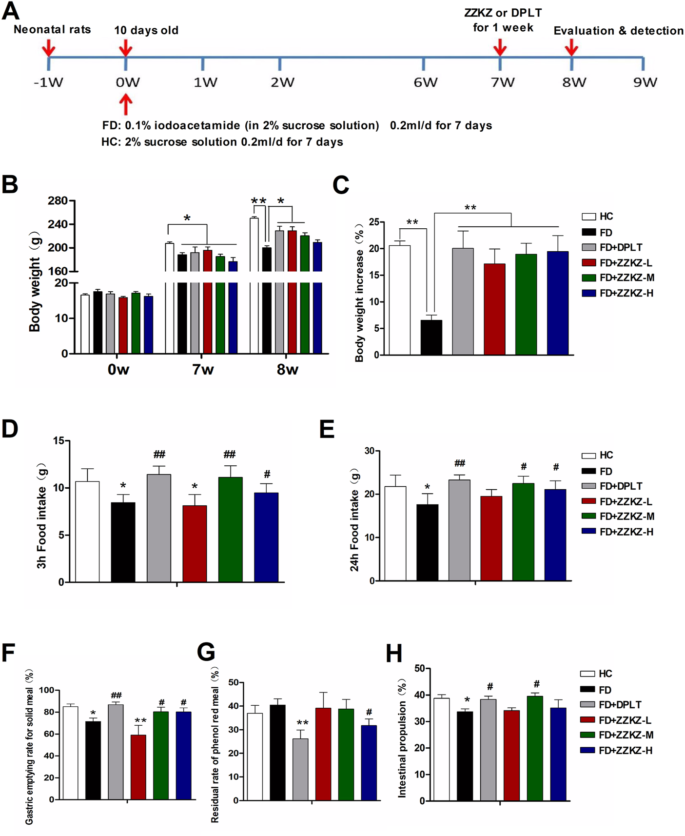 ZZKZ promoted weight gain, food intake, gastric emptying and intestinal propulsion in FD rats. (A) The study protocol of FD models and treatment. (B) Changes in body weight, and (C) body weight gain in the week after ZZKZ treatment in different groups. N = 6–8; *p < 0.05, **p < 0.01 (D–E) Food intake in different groups, including quick eating (3-h food intake) and total ingestion (24-h food intake). N = 6–8; *p < 0.05 vs. HC; #p < 0.05, ##p < 0.01 vs. FD. (F) Gastric emptying rate for the solid meal, (G) residual rate of phenol red meal, and (H) intestinal propulsion rate in different groups. N = 6–8; *p < 0.05, **p < 0.01 vs. HC; #p < 0.05, ##p < 0.01 vs. FD.