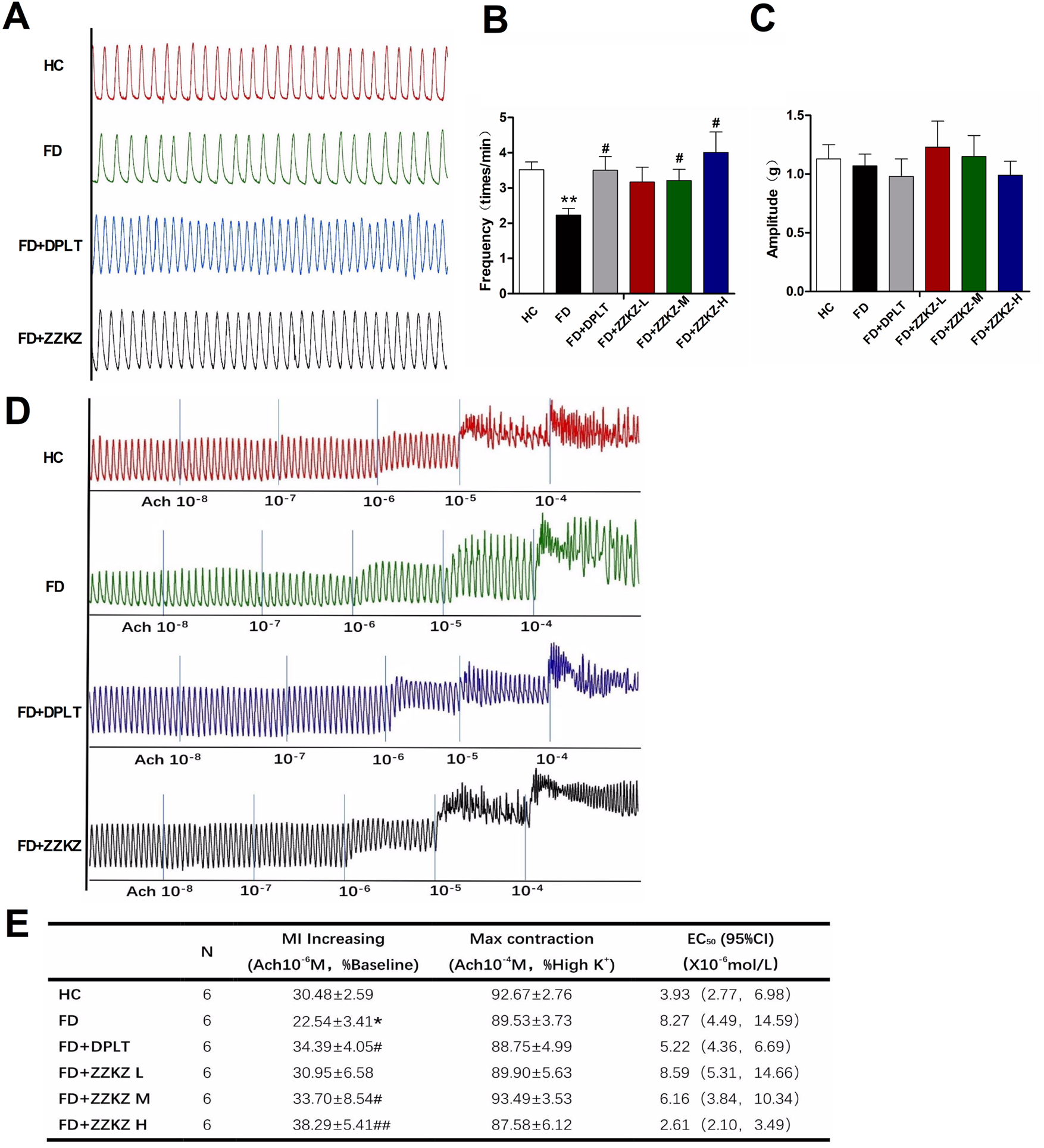 ZZKZ promoted the contractions of gastric smooth muscle in FD rats. (A) The typical spontaneous contractile curve of gastric smooth muscle strips. (B,C) Frequency and amplitude of spontaneous contractions in different groups. N = 6; **p < 0.01 vs. HC; #p < 0.05 vs. FD (D) The typical contractile curve of gastric muscle strips to gradient acetylcholine (10−8 mol/L to10−4 mol/L) (E) Statistics of increasing in MI induced by ACh at a dose of 10−6 mol/L, max contraction induced by ACh at a dose of 10−4 mol/L, and concentration at 50% of maximal effect (EC50) of ACh to the contractions of gastric muscle strips in different groups. N = 6; *p < 0.05 vs. HC; #p < 0.05, ##p < 0.01 vs. FD.