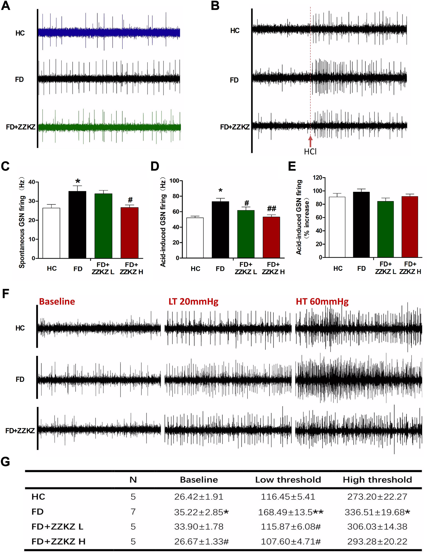 ZZKZ alleviated the spontaneous and stimulated firing of greater splanchnic afferents in FD rats. (A) Typical records of spontaneous GSN firing in different groups. (B) Frequency of spontaneous GSN discharge. N = 6; *p < 0.05 vs. HC; #p < 0.05 vs. FD. (C) The typical records of acid (5 mM HCl)-induced GSN firing. (D,E) Frequency of acid-induced GSN discharge. N = 6; *p < 0.05 vs. HC; ##p < 0.01 vs. FD. (F) The typical records of GSN firing induced by intragastric distension, including the low threshold fibres (20 mmHg) and high threshold fibres (60 mmHg). (G) Statistics of the frequency GSN firing at baseline, and at the conditions of 20 mmHg and 60 mmHg intragastric distension. N = 5–7; *p < 0.05, **p < 0.01 vs. HC; #p < 0.05 vs. FD.