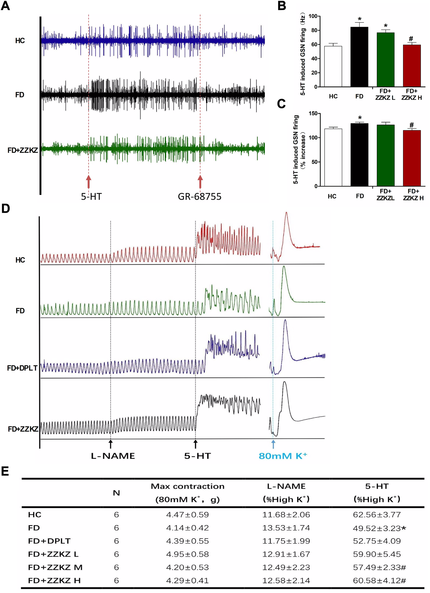 ZZKZ ameliorated 5-HT-induced greater splanchnic afferents firing and smooth muscle contraction in FD rats. (A) The typical records of 5-HT induced GSN firing, as well as the effects of GR-68755. (B,C) Frequency of 5-HT-induced GSN discharge. N = 6; *p < 0.05 vs. HC; #p < 0.05 vs. FD (D) The typical contractile curve of gastric smooth muscle strips induced by L-NAME and 5-HT. The contractile response induced by 80 mM K+ (high K + -mediated depolarisation) is considered as a reference for maximum contractility of the muscle strips. (E) Statistics of the motility index (MI) of gastric muscle strips, including L-NAME and 5-HT induced contractions, and the max contraction in different groups. N = 6; *p < 0.05 vs. HC; #p < 0.05 vs. FD.