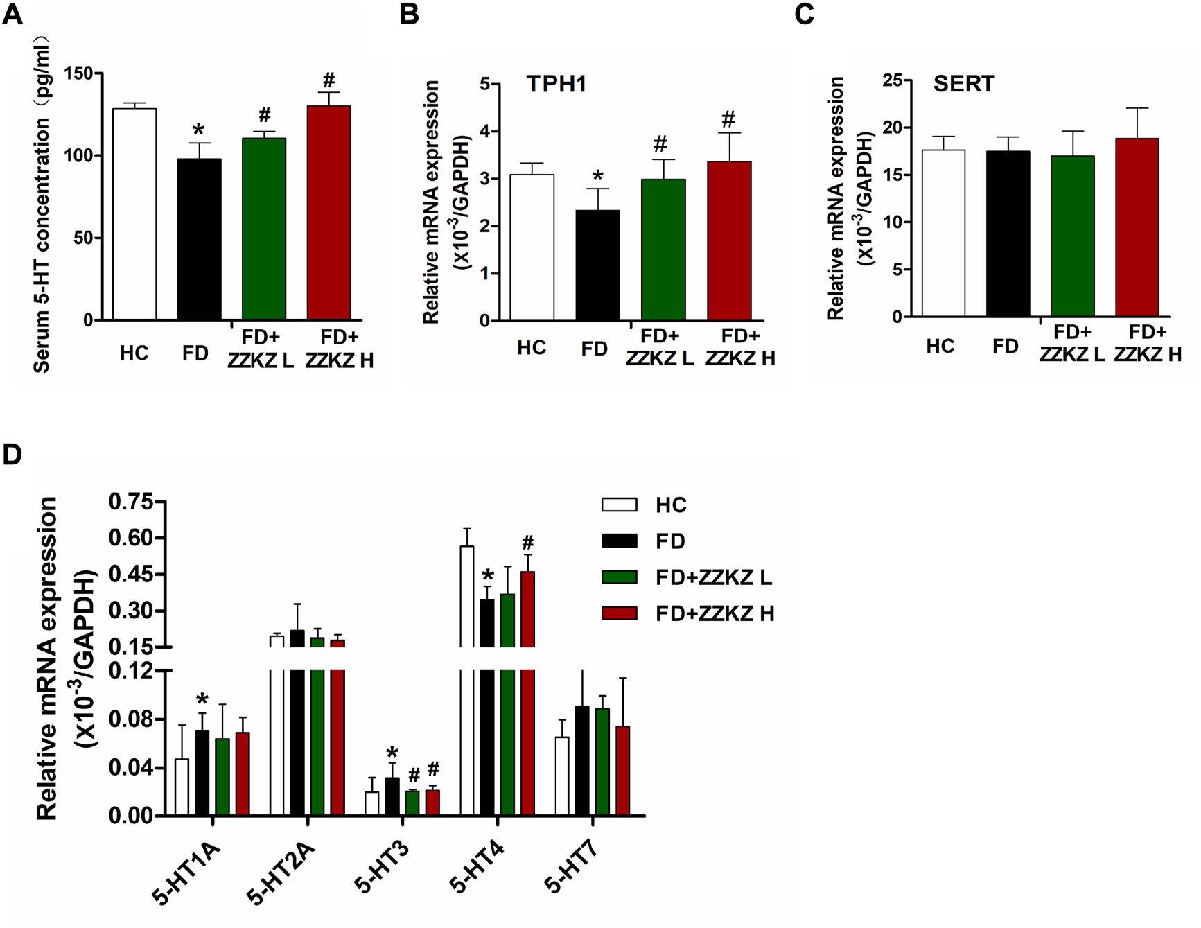 ZZKZ regulated the levels of serum 5-HT and its receptors in the gut of FD rats. (A) Concentration of 5-HT in serum. (B,C) The mRNA expression of tryptophan hydroxylase 1 (TPH1) and serotonin transporter (SERT) in gastric tissues. (D) The gene expression of gastric 5-HT receptors, including 5-HT1A, 5-HT2A, 5-HT3, 5-HT4, 5-HT7 receptors. N = 6–8; *p < 0.05 vs. HC; #p < 0.05 vs. FD.