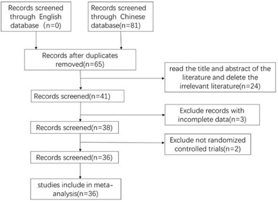 A total of 147 related articles were initially detected. After excluding 82 replicate studies, 65 RCTs were included for further screening. After a detailed reading of the article titles and abstracts, 24 irrelevant studies, 3 studies with incomplete data, and 2 non-RCT studies were excluded. Finally, 36 studies were included (Mo and Zhao, 2002; Song et al., 2002; Zeng, 2005; Li et al., 2006; Guo et al., 2010; Li et al., 2010; Zhang, 2011; Zhi-Qing et al., 2011; Zhang et al., 2012; Guo et al., 2013; Zou, 2013; Guo, 2014; He and Sheng, 2014; Meng, 2014; Zong et al., 2014; Li, 2015; Xu et al., 2015; Li, 2016; Li and Chen, 2016; Sun, 2016; Zhao et al., 2016; Li and Hou, 2017; Wang and Qin, 2017; Wang et al., 2017; Yan et al., 2017; Wang, 2018; Wang et al., 2018; Zhang et al., 2018; Zhang and Zhang, 2018; Zhao, 2018; Fen et al., 2019; You and Wang, 2019; Zhang et al., 2019; Wang, 2020; Zhang, 2020; Wang, 2021), with a total of 3231 patients with PAMIHF for the systematic review and meta-analysis. Figure 1 describes the literature screening process and results, and details for search results are supplied in Supplementary File S1.