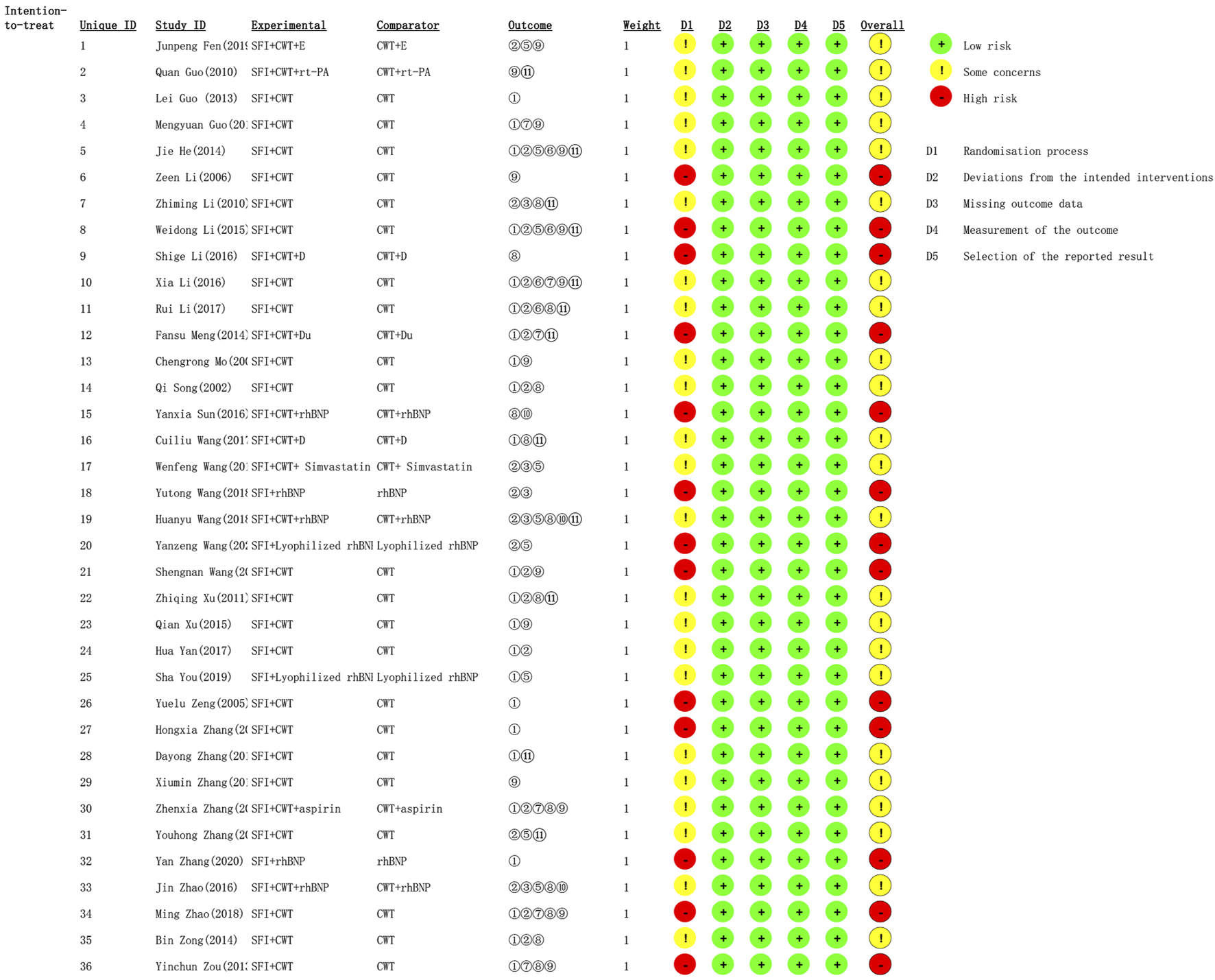 | Guo et al. (2010) | 35/35 | 65.2 ± 14.2/63.7 ± 13.6 | 14 days | SFI plus CWT + rt-PA | CWT + rt-PA | Diluted in 0.9% NS 100ml, IVGTT | d | Death | ⑨⑪ |