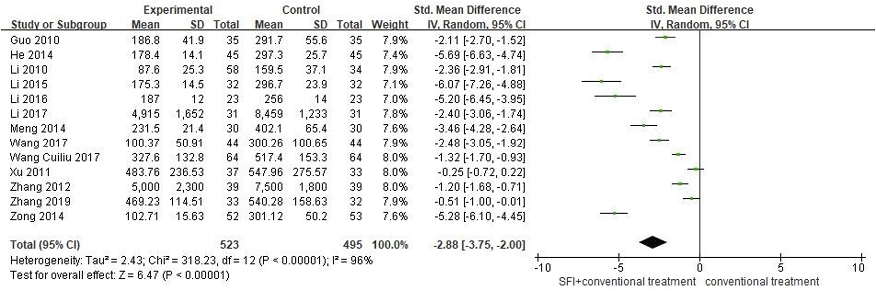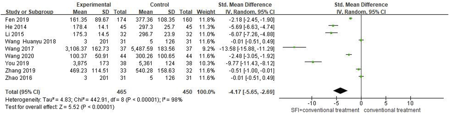 Nine studies (He and Sheng, 2014; Li, 2015; Zhao et al., 2016; Wang et al., 2017; Wang et al., 2018; Fen et al., 2019; You and Wang, 2019; Zhang et al., 2019; Wang, 2020) involving 915 patients reported NT-proBNP outcomes. A random-effects model was used for meta-analysis because of high heterogeneity between studies (p < 0.00001, I2 = 98%). The sensitivity analyses did not find sources of heterogeneity. A meta regression analysis further explored that sample size, duration, age, type of disease, and usage were not the source of heterogeneity (p > 0.05, As Table 2 showed; for details see Supplementary Table S5). Despite lacking the source of high heterogeneity, the meta results showed that the combination of SFI and conventional medical therapy improved NT-proBNP in PAMIHF patients better than conventional medical therapy alone [SMD = −4.17; 95% CI (−5.65, −2.69); p < 0.00001, Figure 3]; thus, future rigorous RCTs with large sample were required to confirm this meta result.