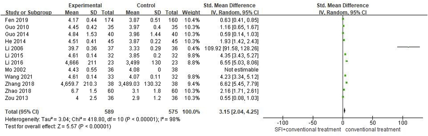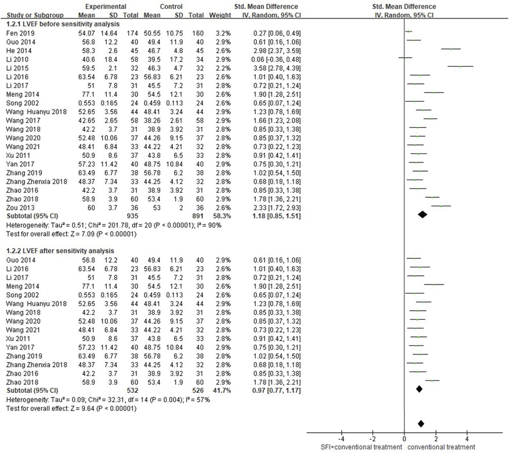 In this study, we aimed to elucidate the efficacy and safety of SFI as an adjunctive treatment for AMI-HF through the available evidence in practice. We mainly focused on clarifying whether SFI combined with conventional therapy had an adjuvant effect compared with conventional therapy alone and was as safe as conventional therapy.