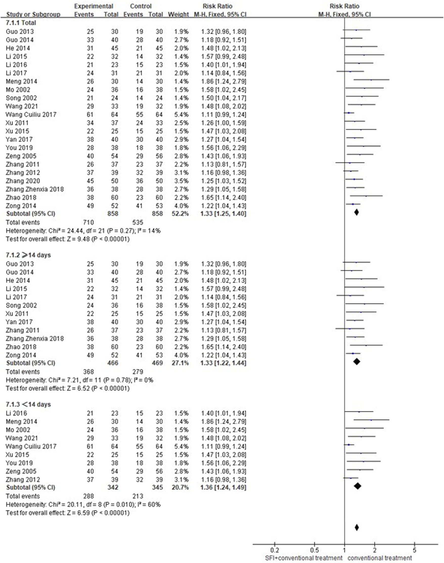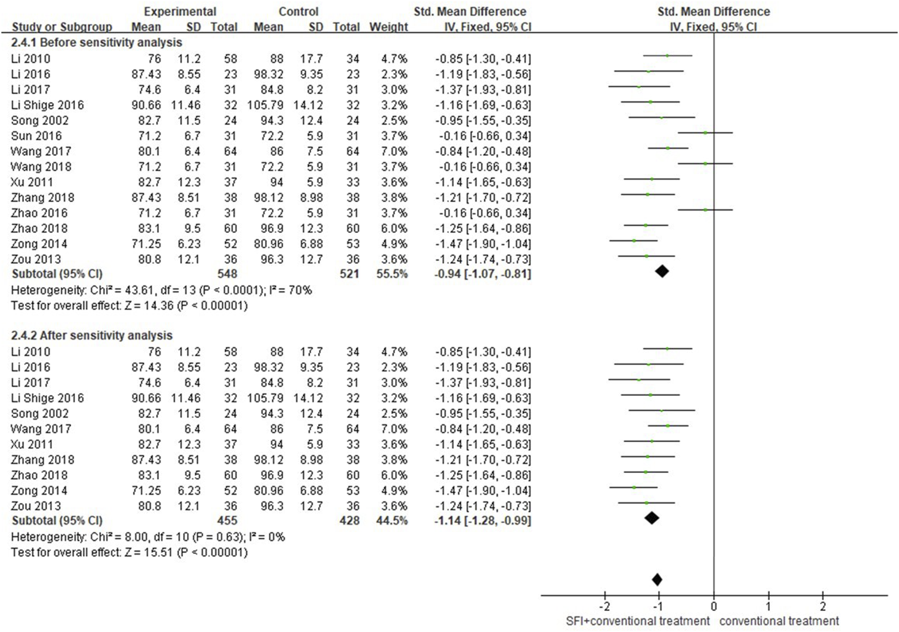 | Li and Chen (2016) | 23/23 | 68.60 ± 2.60/68.70 ± 2.60 | 14 days | SFI plus CWT | CWT | Diluted in 5% GS 200ml, IVGTT | i | Bleeding | ①②⑥⑦⑨⑪ |