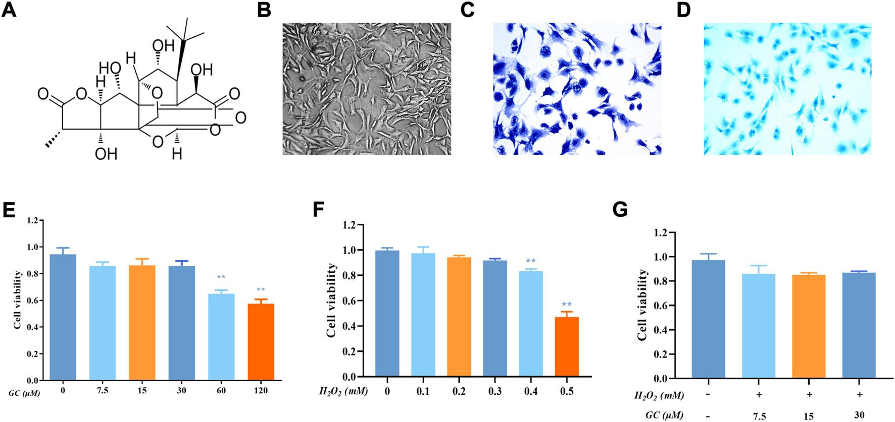 Effect of Ginkgolide C (GC) on chondrocyte viability with or without H2O2. (A) Chemical structure of the GC. (B) Representative image of second-generation chondrocytes rat chondrocyte morphology. (C) Representative image of Toluidine blue staining. (D) Representative image of Allison blue staining. (E) Cell Counting Kit-8 (CCK-8) detected the cell viability of chondrocytes with different concentrations of GC for 24 h (F) CCK-8 results for chondrocytes treated with different concentrations of hydrogen peroxide (H2O2) for 24 h (G) CCK-8 results for GC-treated chondrocytes stimulated with H2O2. All data are presented as mean ± SD (n = 3). **p < 0.01 relative to the control group.