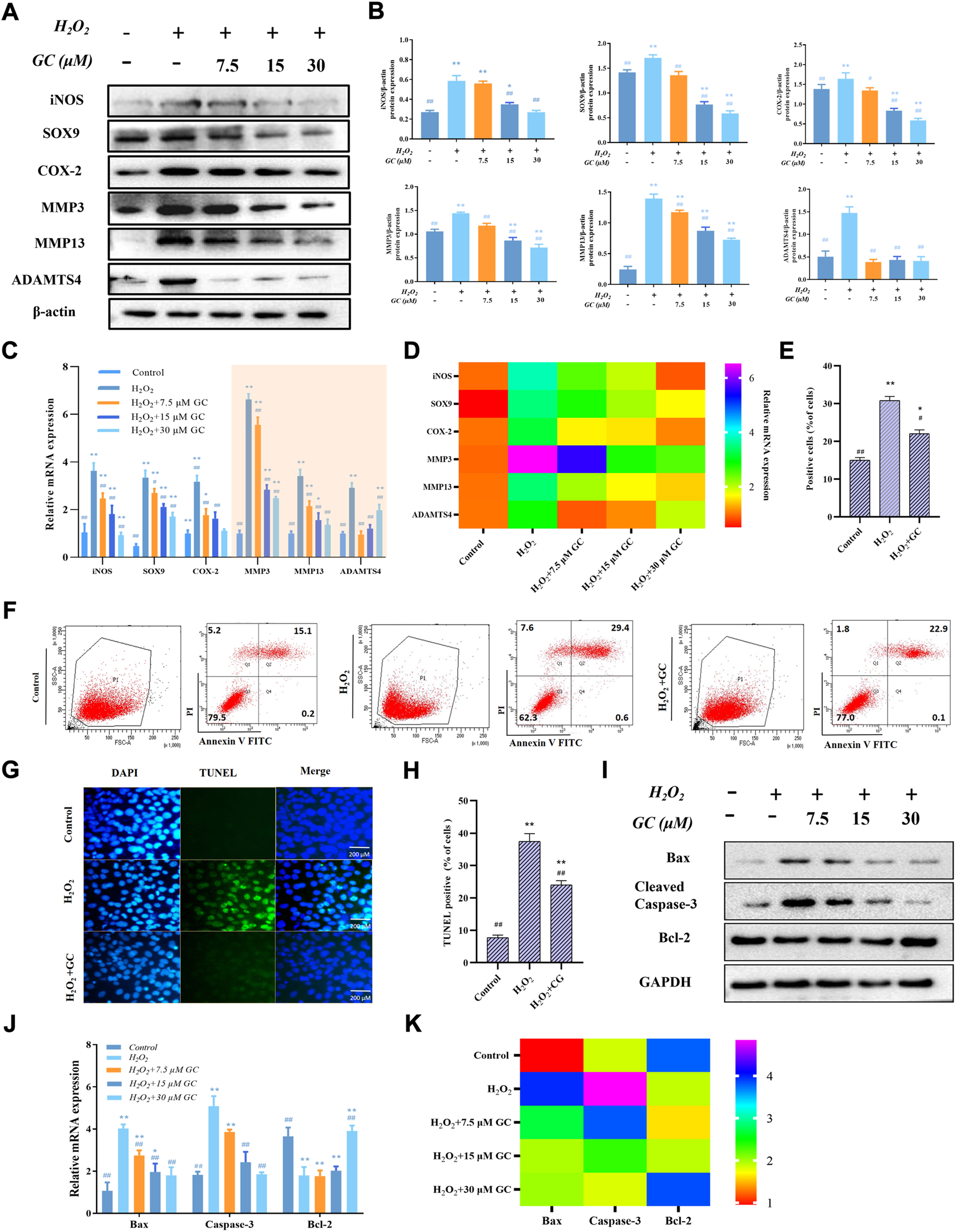 GC inhibits H2O2-induced chondrocyte apoptosis and cartilage degradation. (A) By using a western blot, it was possible to identify the protein expression of iNOS, COX-2, SOX-9, MMP3, MMP13, and ADAMTS4 in chondrocytes that had been exposed to GC and H2O2 for 24 h. (B) Using ImageJ, the related protein expression was examined. (C and D) The expression levels of certain cartilage degeneration-related genes were evaluated using qPCR. (E and F) Annexin V/PI detected GC on H2O2-induced chondrocyte apoptosis. When calculating the apoptosis rate, the sum of the apoptosis rates in the Q2 and Q4 quadrants was used, that is, the late apoptotic group + the early apoptotic group (that is, all AnnexinV positive groups, of which the Q2 quadrant was the PI staining positive group). (G) Examples of terminal deoxynucleotidyl transferase-positive, deoxyuridine triphosphate nick end-labeled nuclei (green color). 200 µm scale bar. (H) Percentages of TUNEL-positive cells relative to total cells. (I) Western blot analysis was used to identify the protein expression of Cleved-caspase 3, Bax, and Bcl-2 in chondrocytes co-applied with GC and H2O2 for 24 h (J and K) The expression levels of certain apoptosis-related genes were evaluated using qPCR. All data are presented as mean ± SD (n = 3). *p < 0.05 and **p < 0.01 vs. control group; #p < 0.05 and ##p < 0.01 vs. H2O2 group.