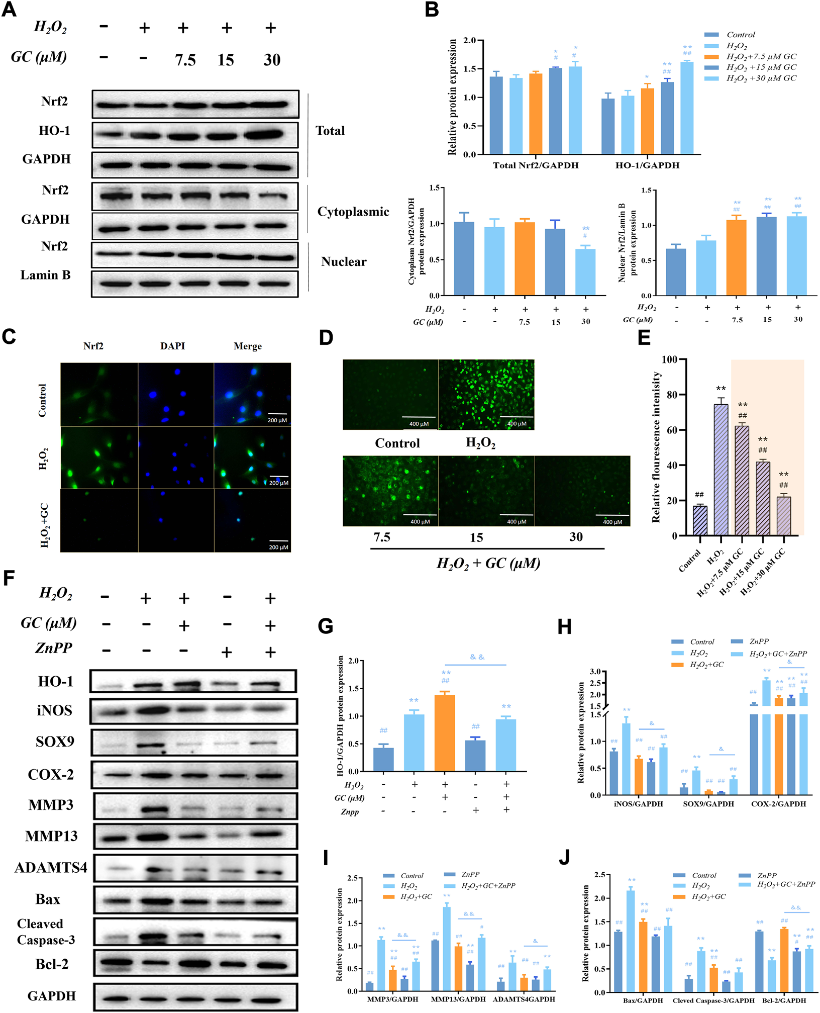 The expression of HO-1 in chondrocytes that have been exposed to H2O2 is linked to the anti-apoptotic and anti-chondral degrading effects of GC. (A and B) Western blot images and quantification information for the protein expression of the Nrf2/HO-1 signaling pathway in each group following the aforementioned treatment. (C) Immunofluorescence detection of nuclear translocation of Nrf2 protein with DAPI staining for nuclei. 200 µm scale bar. (D and E) Dichlorodihydrofluorescein diacetate (DCFH-DA) fluorescent staining showed that GC inhibited the H2O2 induced ROS production. 400 µm scale bar. (F–J) Western blot imaging and quantification data for each group treated with H2O2, GC, and 10 μM Zinc (II) Protoporphyrin IX (ZnPP) for HO-1, iNOS, SOX9, COX-2, MMP3, MMP13, ADAMTS4, Bcl-2, Bax, and Cleved-caspase 3. All data are presented as mean ± SD (n = 3). *p < 0.05 and **p < 0.01 vs. control group; #p < 0.05 and ##p < 0.01 vs. H2O2 group; &p < 0.05 and &&p < 0.01 vs. H2O2 + GC group.