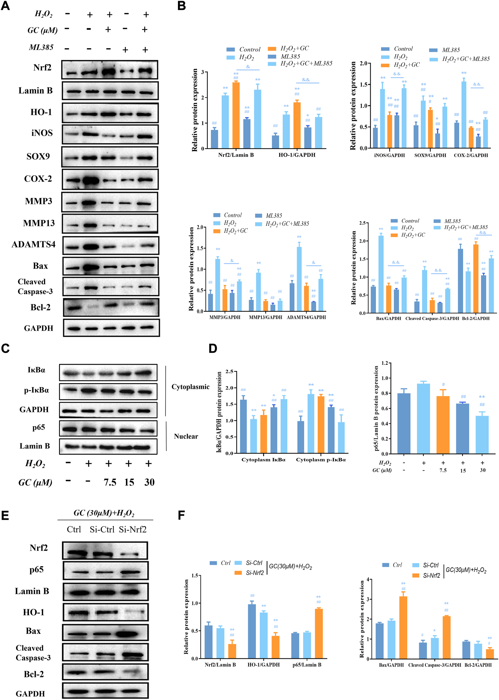 GC exerts protective effect on H2O2-induced chondrocytes through Nrf2/HO-1 and NF-κB pathways. (A and B) Western blot images and quantification data of Nrf2, HO-1, iNOS, SOX9, COX-2, MMP3, MMP13, ADAMTS4, Bcl-2, Bax, and Cleved-caspase three for each group treated with 30 μM GC, H2O2, and 10 μM ML385. (C and D) Western blot image and quantification data for cytoplasm IκBα, p-IκBα, and nuclear p65 protein expression for each group treated with GC and H2O2. (E and F) After transfection with Nrf2 siRNA, the protein expression levels of Nrf2 and p65 in the nucleus and HO-1, Bax, Cleved-caspase 3, and Bcl-2 in the cytoplasmic of chondrocytes co-applied with GC and H2O2 were analyzed by western blot. All data are presented as mean ± SD (n = 3). **p < 0.01 vs. control group; ##p < 0.01 vs. H2O2 group; &p < 0.05 and &&p < 0.01 vs. H2O2 + GC group.