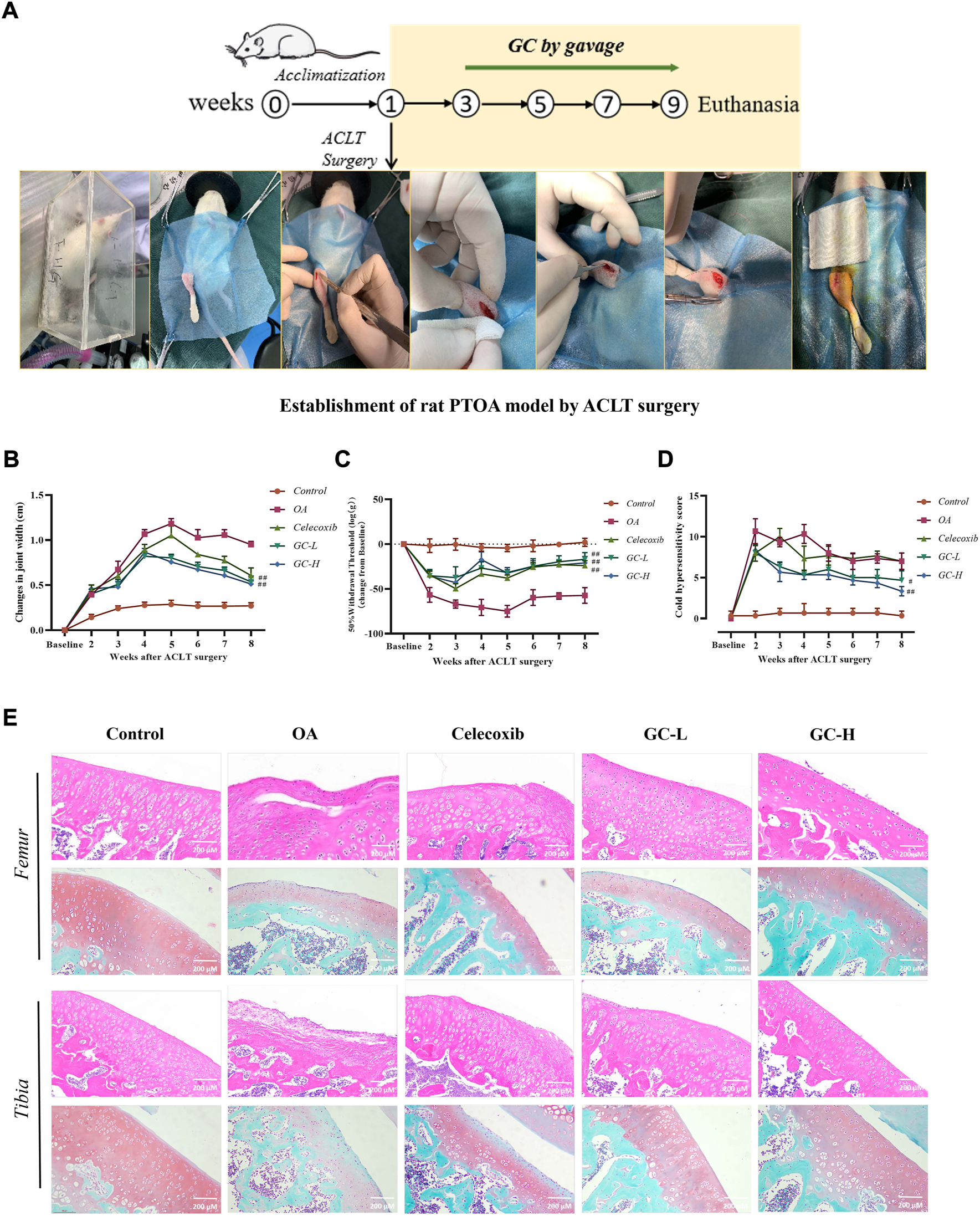 GC attenuates the severity of joint pain and cartilage degeneration in ACLT rats. (A) Schematic of the dosing time-course of the rat anterior cruciate ligament transection (ACLT)-induced knee OA model. (B) Knee width Measurement. (C) Mechanical sensitivity. (D) Cold hypersensitivity. (E) Representative images of the knee joint stained with hematoxylin-eosin (HE) and Saffron O Fast Green (SO-FG). 200 µm scale bar. All data are presented as mean ± SD (n = 3). *p < 0.05 and **p < 0.01 vs. control group; #p < 0.05 and ##p < 0.01 vs. OA group.