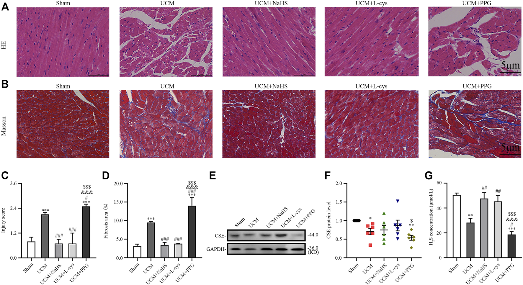 H2S treatment inhibit myocardial disarray and fibrosis in UCM mice, whereas H2S deficiency aggravates injuries. (A) Representative images for H&E staining of heart tissues. Scale bar = 5 μm. (B) Representative images of Masson’s trichrome staining of heart tissues. Scale bar = 5 μm. (C) Statistical testing results of injury level scoring, with n = 3 per group. (D) Statistical testing results of the fibrosis area, with n = 3 per group. (E) Representative Western blot images of CSE expressions in the heart tissue of the five groups of mice. (F) Quantification of CSE protein expressions in the in the heart tissue of the five groups of mice, with n = 6 per group. (G) Quantification of H2S concentration in the heart tissue of the five groups of mice, with n = 6 per group. Data are represented as Mean ± SEM. *p < 0.05, **p < 0.01, ***p < 0.001 vs. Sham group; #p < 0.05, ##p < 0.01, ###p < 0.001 vs. UCM group; &&&p < 0.001 vs. UCM + NaHS group; $p < 0.05, $$$p < 0.001 vs. UCM + L-cys group.