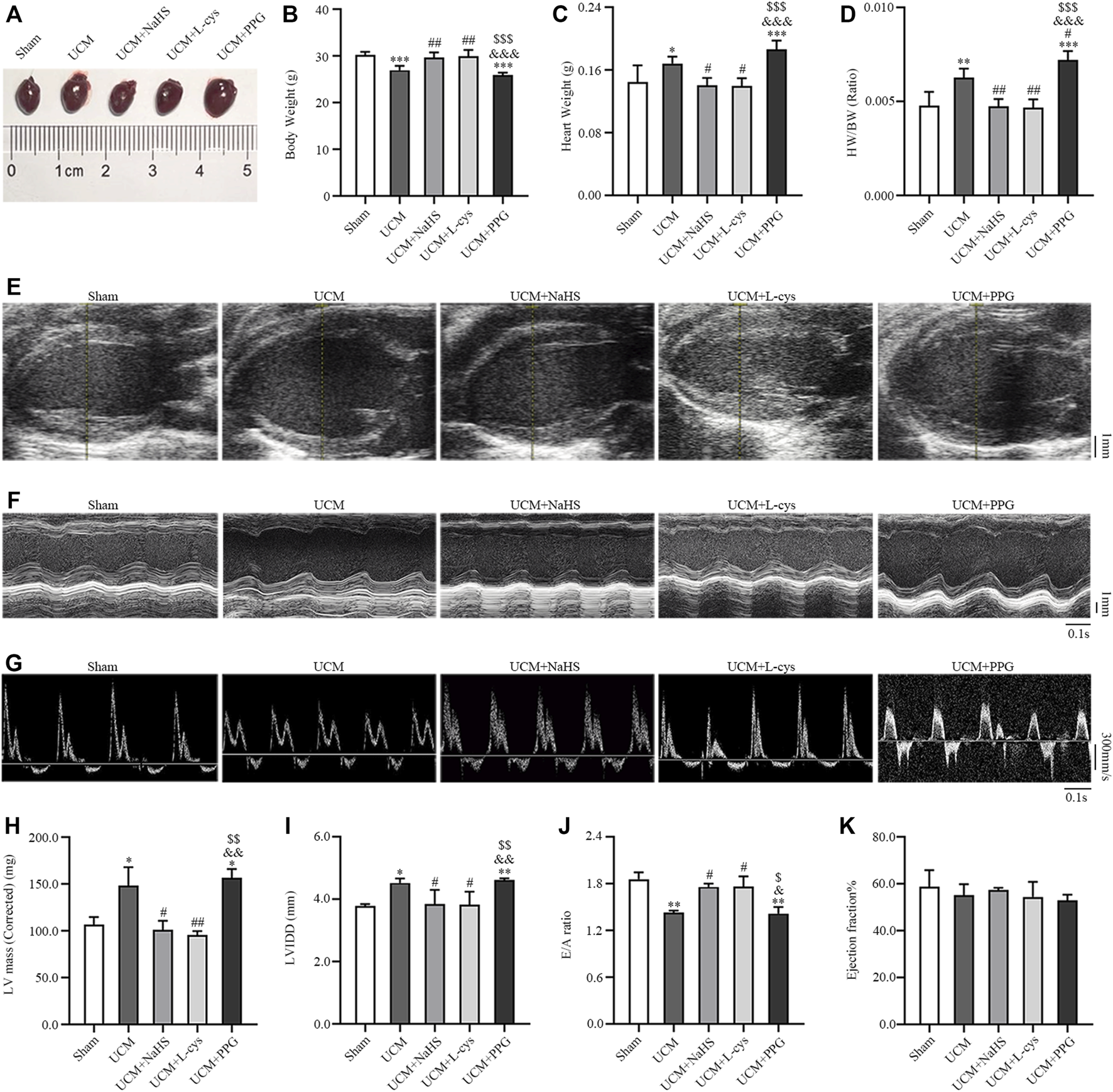 NaHS and L-cys treatment improved left ventricular hypertrophy (LVH) and diastolic dysfunction in UCM mice. (A) Representative images of heart tissues in the five groups of mice. (B–D) H2S treatment reduces heart weight and heart weight/body weight. n = 6 per group. (E–G) Representative echocardiographic images in the five groups of mice. (E) Two-dimensional echocardiograms showing left ventricular long-axis views, with scale bar in mm on right. (F) M-mode echocardiograms showing left ventricular dimensions, with scale bar in mm on right and time stamp in seconds at the bottom. (G) Pulse-wave Doppler echocardiograms depicting mitral inflow velocities, with scale bar in mm on right and time stamp in seconds at bottom. (H–K) H2S treatment improves LVH and diastolic dysfunction in UCM mice. n = 3 per group. E/A: the ratio of the early to late diastolic mitral inflow velocities; LVIDd: LV internal diameters at end-diastole; HW/BW: heart weight/body weight. Data are represented as Mean ± SEM. *p < 0.05, **p < 0.01, ***p < 0.001 vs Sham group; #p < 0.05, ##p < 0.01 vs. UCM group; &p < 0.05, &&p < 0.01, &&&p < 0.001 vs. UCM + NaHS group; $p < 0.05, $$p < 0.01, $$$p < 0.001 vs. UCM + L-cys group.