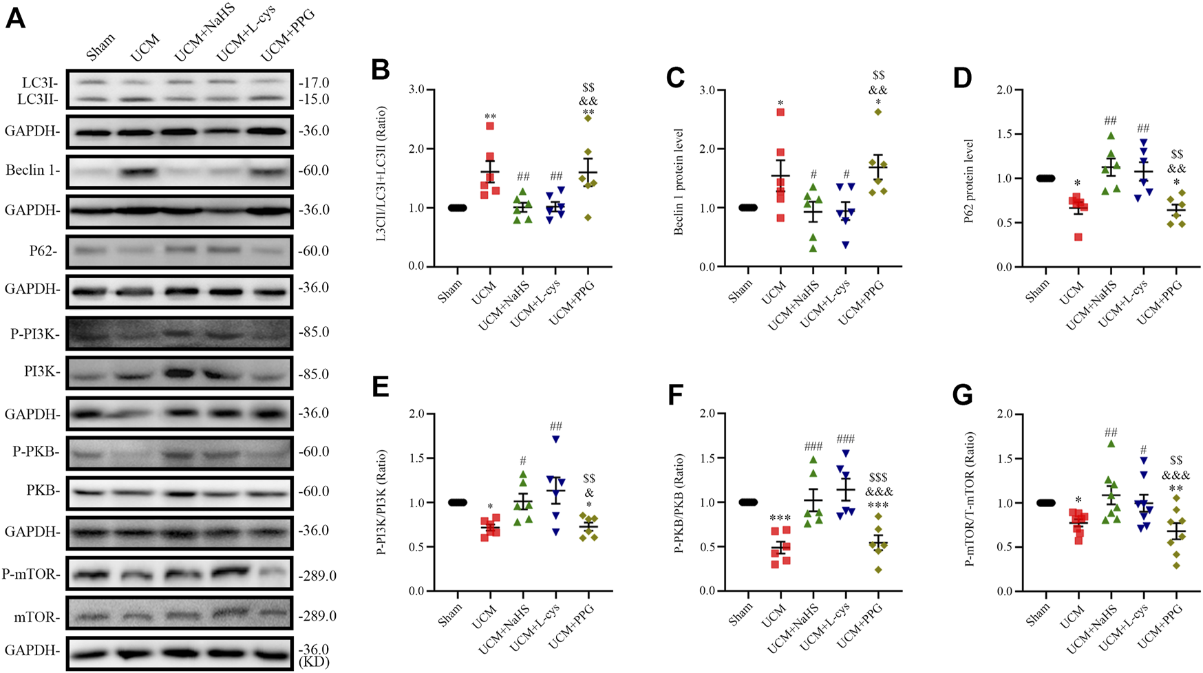 NaHS and L-cys treatment inhibit PI3K-PKB-mTOR-activated autophagy in UCM mice. (A) Representative Western blot images of LC3, becline-1, P62, p-PI3K/PI3K, p-PKB/PKB and p-mTOR/mTOR in the heart tissue of the five groups of mice. (B–D) Quantification of the LC3II/LC3 (I + II) ratio, becline-1 protein levels, and p62 protein levels in the heart tissue of the five groups of mice, with n = 6 per group. (E–G) Quantification of the p-PI3K/PI3K (n = 6 per group), p-PKB/PKB (n = 6 per group) and P-mTOR/mTOR (n = 8 per group) levels in the heart tissue of the five groups of mice. Data are represented as Mean ± SEM. *p < 0.05, **p < 0.01, ***p < 0.01 vs. Sham group; #p < 0.05, ##p < 0.01, ###p < 0.001 vs. UCM group; &p < 0.05, &&p < 0.01, &&&p < 0.001 vs. UCM + NaHS group; $$p < 0.01, $$$p < 0.001 vs. UCM + L-cys group.