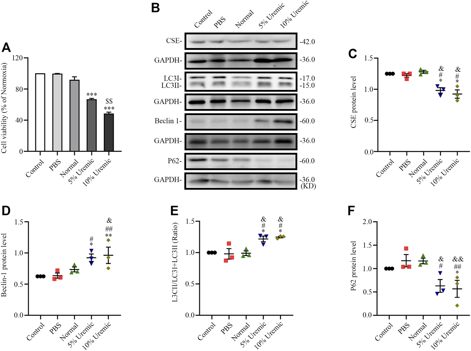 Effects of serum uremia on the expressions of cystathionine gamma-lyase (CSE) protein and autophagy-associated protein. (A) Cell viability was measured using the CCK-8 assay, with n = 3 per group. (B) Representative Western blot images of CSE, LC3, becline-1, and P62 in the five groups of H9C2 cardiomyocytes (C–F) Quantification of the CSE protein levels, LC3II/LC3 (I + II) ratio, becline-1 protein levels, and p62 protein levels in the five groups of H9C2 cardiomyocytes. n = 3 per group. Data are represented as Mean ± SEM. *p < 0.05, **p < 0.01, ***p < 0.001 vs. control group; #p < 0.05, ##p < 0.01 vs. PBS group; &p < 0.05, &&p < 0.01 vs normal serum group; $$p < 0.01 vs. 5% uremic serum group.