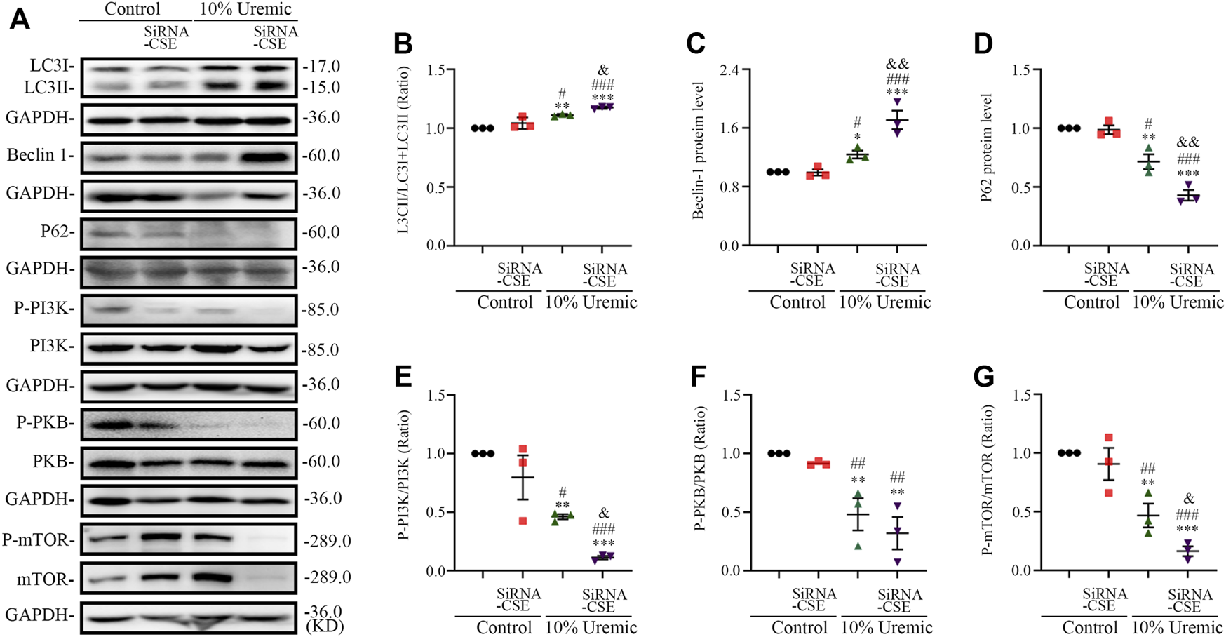 Endogenous H2S deficiency exacerbates uremic serum-induced overactive autophagy in H9C2 cardiomyocytes. (A) Representative Western blot images of LC3, becline-1, P62, p-PI3K/PI3K, p-PKB/PKB, and p-mTOR/mTOR in four groups of H9C2 cardiomyocytes. (B–D) Quantification of the LC3II/LC3 (I + II) ratio, becline-1 protein levels, and p62 protein levels in the four groups of H9C2 cardiomyocytes, with n = 3 per group. (E–G) Quantification of p-PI3K/PI3K, p-PKB/PKB, and p-mTOR/mTOR in four groups of H9C2 cardiomyocytes, with n = 3 per group. Data are represented as Mean ± SEM. *p < 0.05, **p < 0.01, ***p < 0.001 vs. control group; #p < 0.05, ##p < 0.01, ###p < 0.001 vs. 10% control + SiRNA-CSE group; &p < 0.05, &&p < 0.01 vs. 10% uremic serum + SiRNA-CSE group.
