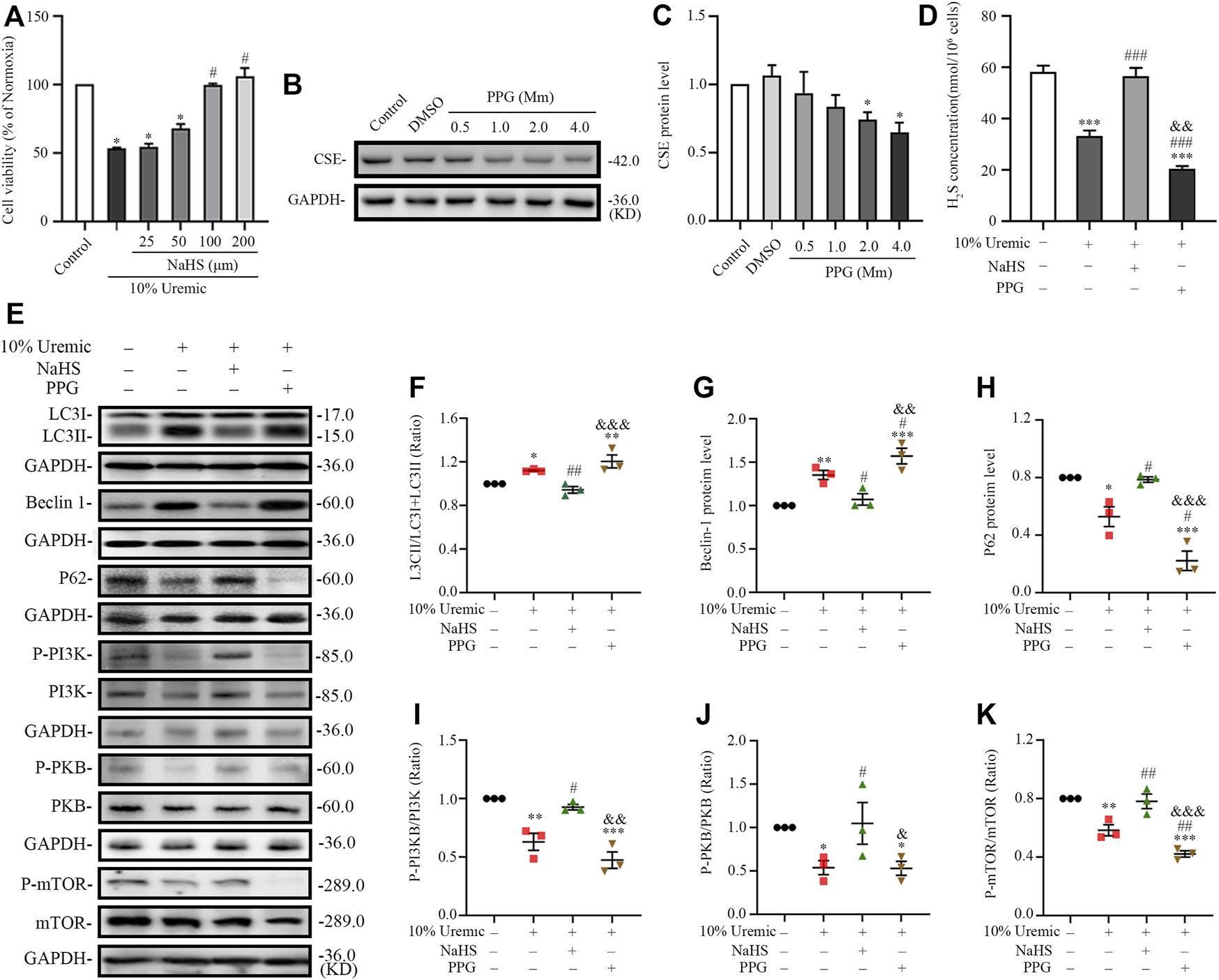 NaHS inhibits uremic serum-induced overactive autophagy in H9C2 cardiomyocytes, whereas deficiency of H2S further activates these effects. (A) Cell viability is measured using the CCK-8 assay, with n = 3 per group. (B) Representative Western blot images of inhibition of PPG on CSE protein levels in H9C2 cardiomyocytes. (C) Quantification of the CSE protein levels in the different concentrations of PPG in H9C2 cardiomyocytes, with n = 5 per group. (D) Quantification of H2S concentration in four groups of H9C2 cardiomyocytes, with n = 3 per group. (E) Representative Western blot images of LC3, becline-1, P62 p-PI3K/PI3K, p-PKB/PKB, and p-mTOR/mTOR in four groups of H9C2 cardiomyocytes. (F–H) Quantification of the LC3II/LC3(I + II) ratio, becline-1 protein levels, and p62 protein levels in the four groups of H9C2 cardiomyocytes, with n = 3 per group. (I–K) Quantification of the p-PI3K/PI3K, p-PKB/PKB, and p-mTOR/mTOR in four groups of H9C2 cardiomyocytes, with n = 3 per group. Data are represented as Mean ± SEM. *p < 0.05, **p < 0.01, ***p < 0.001 vs. control group; #p < 0.05, ##p < 0.01, ###p < 0.001 vs. 10% uremic serum group; &p < 0.05, &&p < 0.01, &&&p < 0.001 vs. 10% uremic serum + NaHS group.