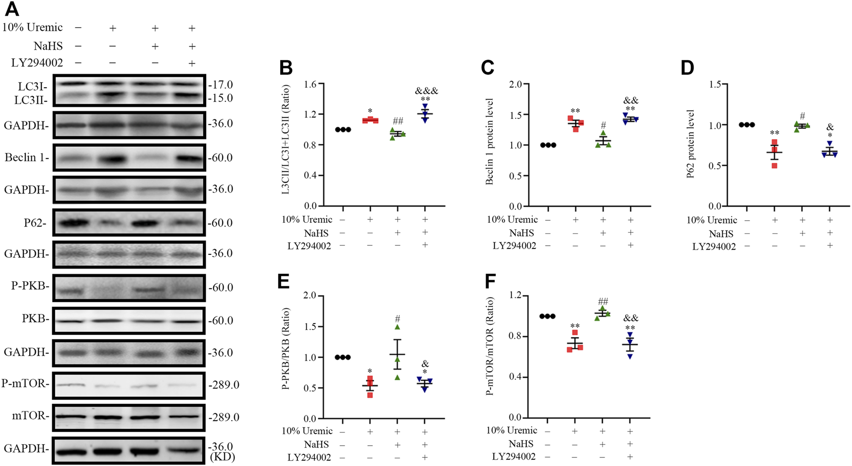 NaHS induces PKB and mTOR phosphorylation via PI3K/PKB pathway in H9C2 cardiomyocytes stimulated by uremic serum. (A) Representative Western blot images of LC3, becline-1, P62, p-PKB/PKB and p-mTOR/mTOR in four groups of H9C2 cardiomyocytes. (B–D) Quantification of the LC3II/LC3 (I + II) ratio, becline-1 protein levels, and p62 protein levels in the four groups of H9C2 cardiomyocytes, with n = 3 per group. (E,F) Quantification of the p-PKB/PKB and p-mTOR/mTOR in four groups of H9C2 cardiomyocytes, with n = 3 per group. Data are represented as Mean ± SEM. *p < 0.05, **p < 0.01 vs. control group; #p < 0.05, ##p < 0.01 vs. 10% serum uremia group; &p < 0.05, &&p < 0.01, &&&p < 0.001 vs. 10% serum uremia + NaHS group.