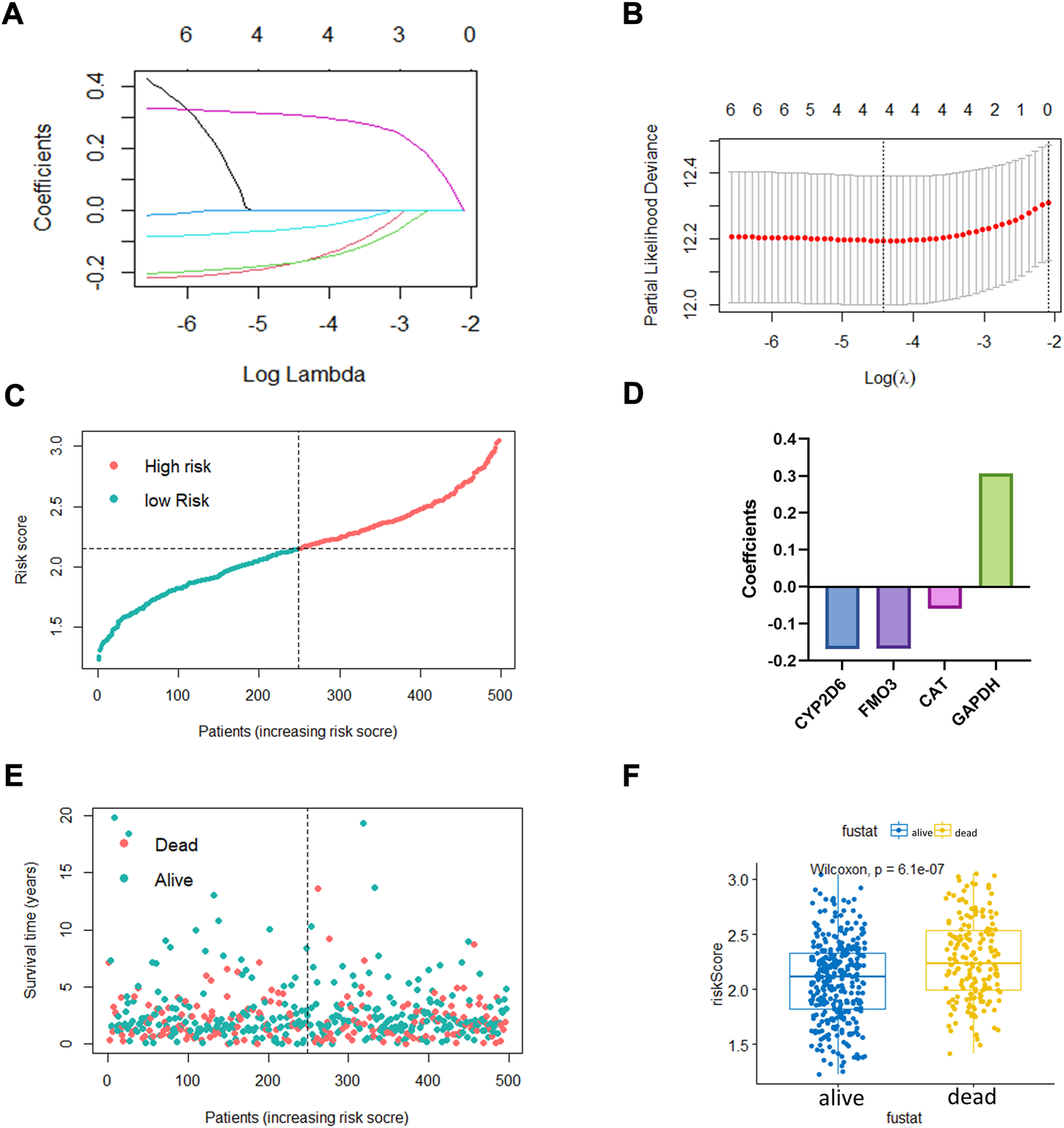 Survival R package and a univariate Cox regression analysis were used to analyze the association between 34 screened genes and overall survival, respectively. The least absolute shrinkage and selection operator (LASSO) regression was conducted to construct the optimal prognostic risk model. Four OxS-related oxidative stress genes were selected. The risk score model was calculated as follows: risk score = (−0.168∗ expression value of CYP2D6) - (0.167 ∗ expression value of FM O 3)—(0.059 ∗ expression value of CAT) + (0.306 ∗ expression value of GAPDH).