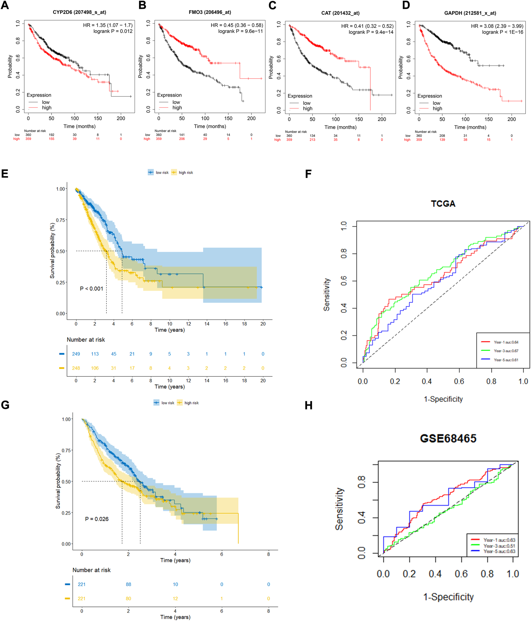 To further confirm the prognostic value of the four OxS-related genes in LUAD, the correlation of gene expression with prognosis was investigated respectively in the Kaplan-Meier plotter database. The results showed the expression of CYP2D6 (p = 0.012) and GAPDH (P < 1e-16) were negatively correlated with OS, whereas the expression of FM O 3 (p = 9.6e-14) and CAT (p = 9.4e-14) were positively correlated with the OS (Figures 3A–D). Next, the prognostic value of the model was explored in the TCGA and GEO datasets. The risk scores of all LUAD patients in the two cohorts were acquired based on the risk calculation formula. Based on the median value of risk score, the LUAD patients in the TCGA cohort were divided into a low-risk group (n = 249) and high-risk group (n = 248). The survival analysis revealed that the patients in the high-risk group exhibited a significantly worse prognosis than the low-risk group (p < 0.001) (Figure 3E). The prognostic value was further verified in the GEO cohort (GSE68465). Compared with the TCGA cohort, the survival analysis in the GSE68465 cohort showed similar results to that of the OS in the high-risk group (n = 221) were obviously shorter than in the low-risk group (n = 221) (Figure 3G). The analysis indicated that the risk score model had good power for predicting the OS of LUAD patients. The AUC at 1, 3, and 5 years achieved 0.64, 0.67, 0.61, and 0.63, 0.51, 0.63, respectively for the TCGA and GSE68465 cohort (Figures 3F,H). Despite the limited 5-year AUC in the GSE68465 cohort, the model had a good ability for predicting patient survival.
