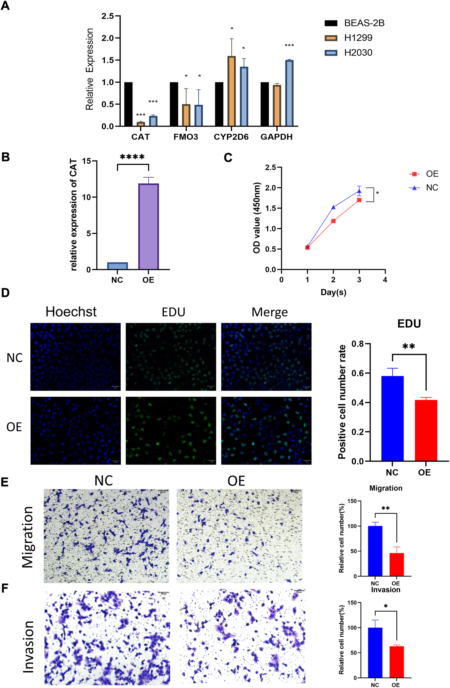 Functional verification of CAT. (A) Expression levels of four genes in cell lines. (B) Construction of CAT overexpression H1299. (C,D) CAT inhibited the proliferation function. (E,F) CAT inhibited the migration and invasion function. (*p < 0.05, **p < 0.01, ***p < 0.001, ****p < 0.0001).