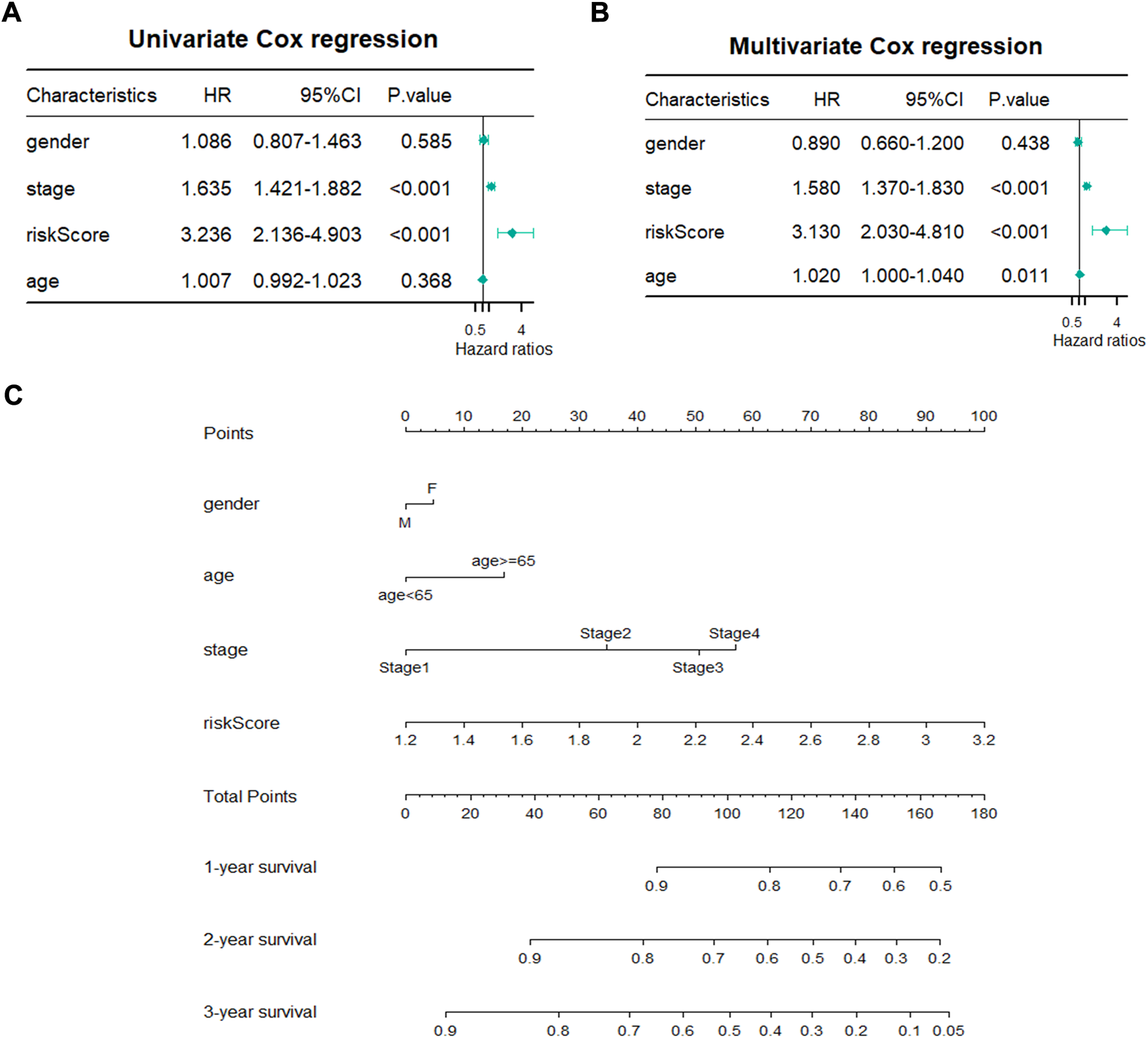Establishment of prognostic nomogram. (A,B) Univariate and Multivariate Cox regression analyses of clinicopathological parameters with overall survival. (C) A novel prognostic nomogram based on gender, pathological stage, risk score and age.