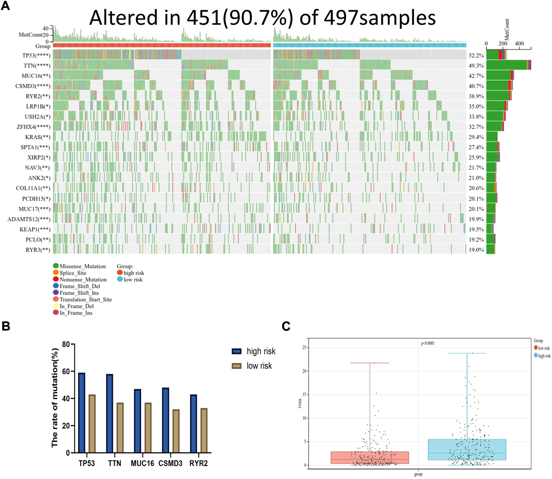 Mutational landscape displayed via TCGA-LUAD database. (A) The waterfall diagram exhibited top 20 genes with highest mutation frequency in LUAD between high and low risk group (*p < 0.05, **p < 0.01, ***p < 0.001, ****p < 0.0001). (B) The mutation frequency of top five genes. (C) The tumor mutation burden of high-risk group was significantly higher than that in low-risk group, p < 0.0001.