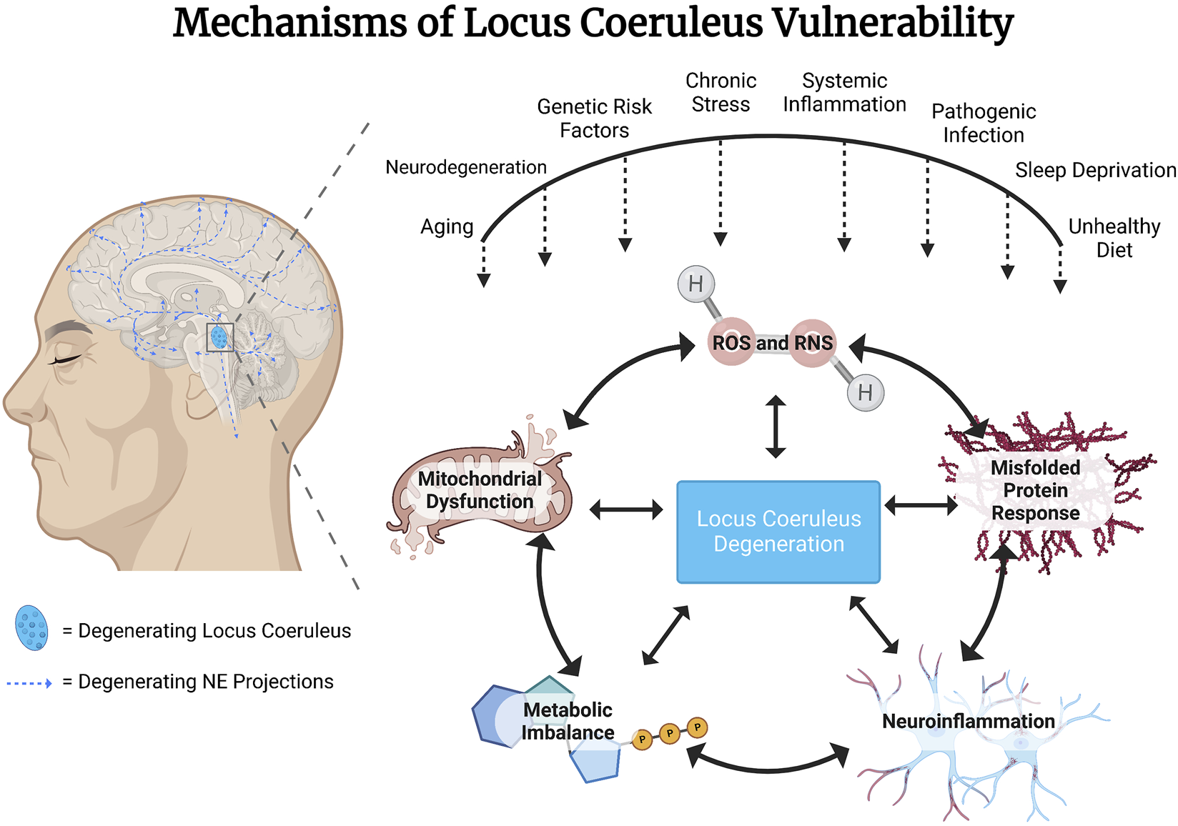 Genetic and environmental risk factors converge to confer vulnerability to locus coeruleus (LC) noradrenergic (NE) neurons. Proximate mechanisms of vulnerability that have been suggested to contribute to LC NE degeneration include actions of reactive oxygen and nitrogen species (ROS/RNS), response to misfolded proteins, neuroinflammatory mechanisms, metabolic imbalance and mitochondrial dysfunction due to high baseline rates of neuronal activity.