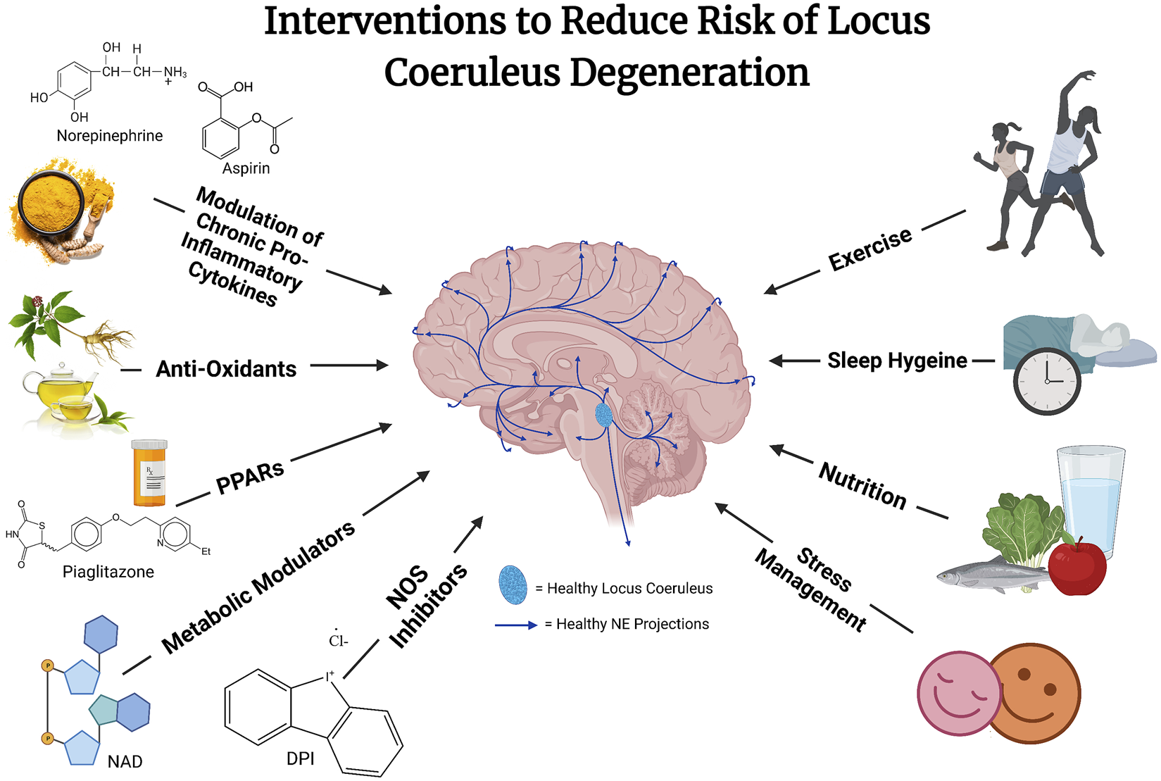 The risk of locus coeruleus degeneration may be reduced through a combination of different interventions. These interventions remain hypothetical and likely will work in concert to reduce vulnerability to what is likely a multi-dimensional disease etiology. Future well designed and controlled studies are needed to explore the efficacy of these approaches.