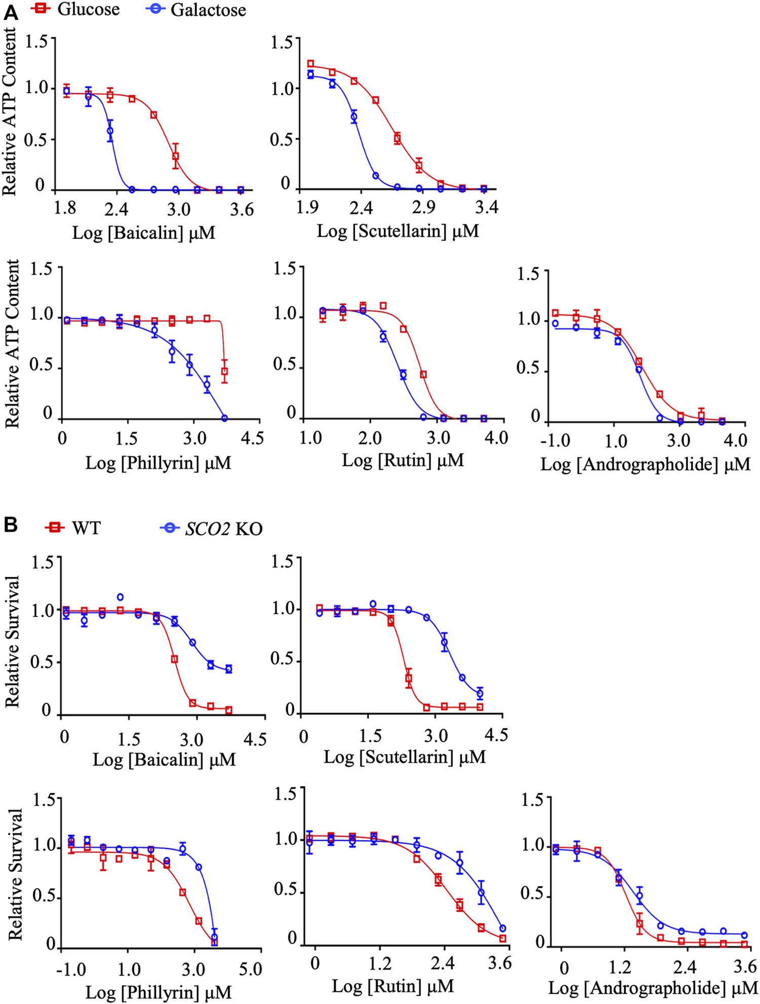 Mitochondria are intracellular powerhouses that generate most of the ATP required for a cell’s biochemical reactions. They are also signaling hubs associated with thermogenesis, metabolite synthesis and transport, redox singling, calcium, copper and iron homeostasis, and cell death (Osellame et al., 2012; Mottis et al., 2019). Mitochondria are characterized by high lipid content in their membranes and proximity to respiratory byproducts of reactive oxygen species, leading them more vulnerable to chemical exposure (Meyer et al., 2018). Consequently, drugs that impede mitochondrial function can cause severe adverse effects. Approximately 35% of pharmaceutically relevant compounds are mitotoxic (Meyer and Chan 2017). Mitochondrial toxicity was the main cause of troglitazone-induced liver injury and cerivastatin-induced rhabdomyolysis, which ultimately led to the withdrawal of these two blockbusters from the market in 1997 and 2001, respectively (Hu et al., 2015; Huang et al., 2019). Drug-induced mitochondrial dysfunction has been observed in many different drug types, such as antivirals, antibiotics, chemotherapy agents, antipsychotics, antiepileptics, and antidepressants, which can lead to ADRs affecting the liver, muscle, kidney, and central nervous system (Stoker et al., 2019). However, mitochondrial toxicity is rarely detected in traditional preclinical animal models (Will and Dykens 2014). Therefore, a series of in vitro methods to detect mitochondrial toxicity have been developed over the past decade. One of the most widely employed high-throughput methods is called the “glucose/galactose” assay, in which glucose in the cell culture media is replaced with galactose, forcing the cells to produce ATP through oxidative phosphorylation (OXPHOS) rather than glycolysis and is therefore susceptible to mitochondrial toxicants (Swiss and Will 2011; Kamalian et al., 2015). In our studies, the human colorectal cancer cell line HCT116 SCO2 KO is deficient in the mitochondrial complex IV assembly SCO2 gene. Compared with the parental wild-type cells (HCT116 WT), HCT116 SCO2 KO cells have insufficient respiratory function and are resistant to the inhibition of cell proliferation by the mitochondrial toxic drug metformin (Sung et al., 2010; Wang et al., 2017). Therefore, the correlation and the scientific basis for combining the two assays is that mitochondrial toxicants can decrease intracellular ATP levels in galactose medium in the first assay, while are less cytotoxic in HCT116 SCO2 KO cells in the second assay.