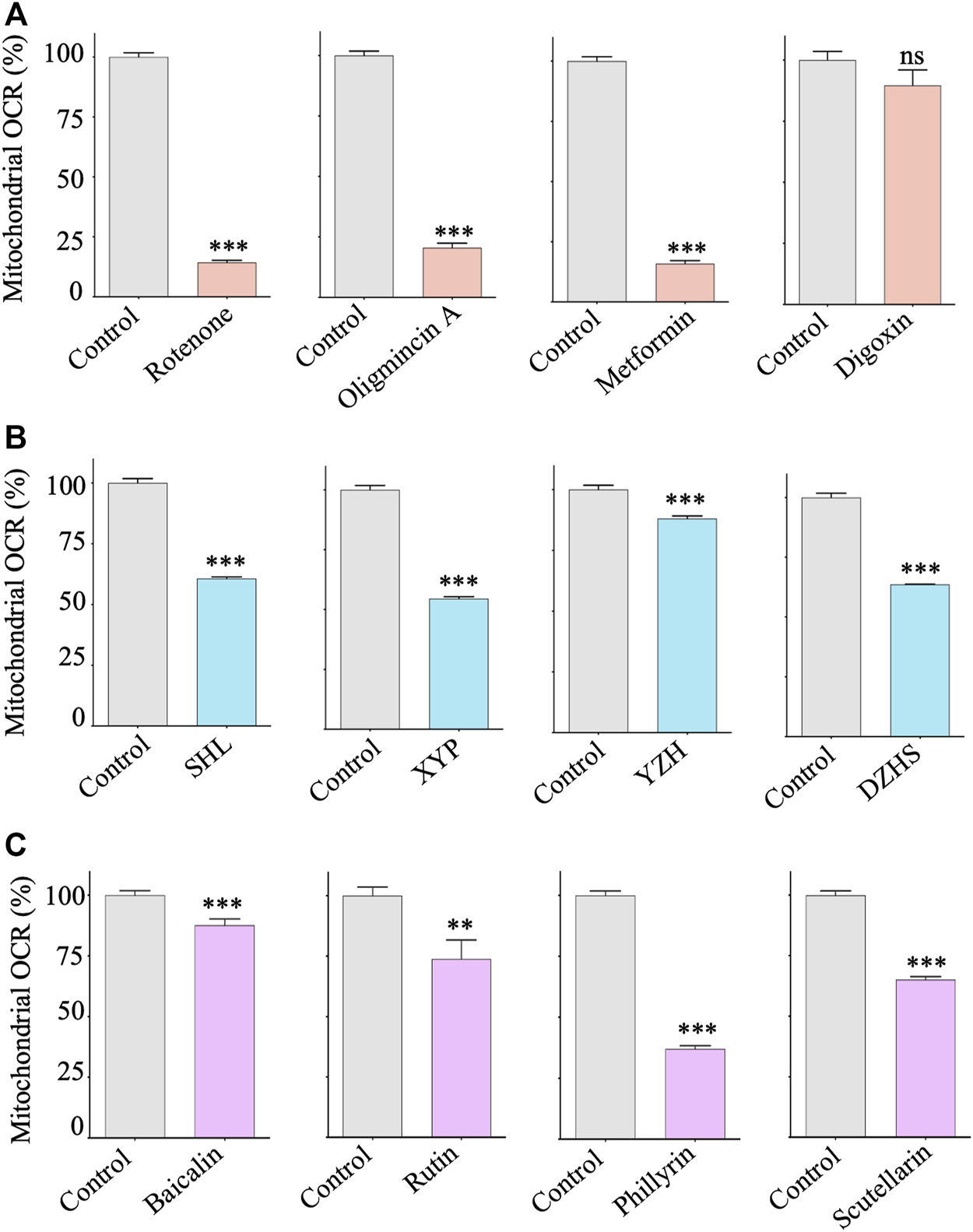 The mitochondrial respiratory activity of HepG2 cells was determined using a fluorescence lifetime micro-oxygen monitoring system from Instech instruments (Plymouth, PA, United States) at 25°C according to the product manual. Briefly, HepG2 cells were inoculated in 6-well plates at a volume of 2500 μl/well at densities of 1 × 106−5 × 106 cells/well and incubated overnight. Then, cells were treated with TCM injections or ingredients at indicated concentrations for 24 h. Changes in %O2 per minute in HepG2 cells were measured according to the manufacturer’s protocol by Fluorescence Lifetime Micro Oxygen Monitoring System. The oxygen consumption rate (OCR) was calculated by the slope of the O2 data using linear regression and the results were reported as %O2 per minute, normalized to the number of cells.