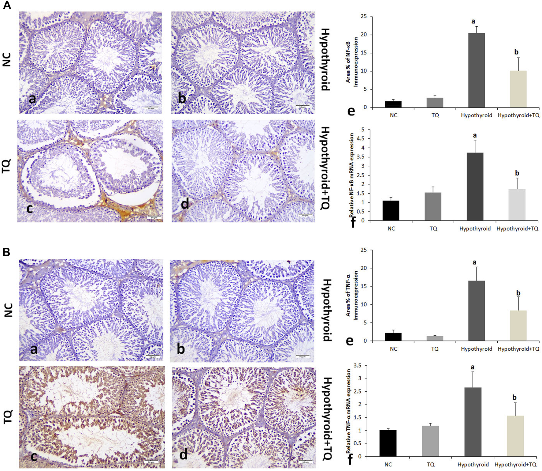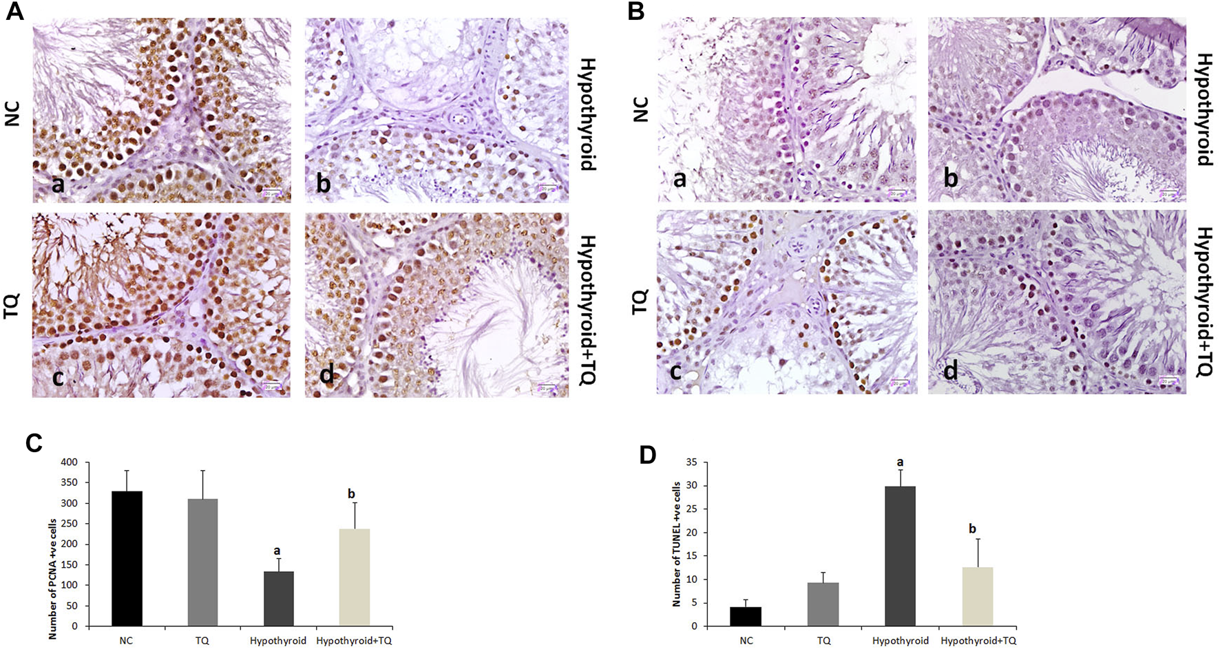 Results: TQ administration successfully improved PTU-induced disturbance in the thyroid hormonal profile (T3, T4, and TSH), serum testosterone level, and pancreatic antioxidants compared to the untreated hypothyroid group. TQ significantly downregulated (p = 0.001, p ˂ 0.001) TNF-α and NF-κB transcription, while it significantly upregulated (p = 0.01) SIRT1 transcription in the testes of hypothyroid rats. TQ markedly relieved the histopathological testicular changes induced by PTU and significantly increased (p = 0.002, p = 0.01) the sectional area of seminiferous tubules and germinal epithelial height, respectively. TUNEL-positive apoptotic germinal cells were significantly decreased (p ˂ 0.001), while PCNA-positive proliferating germinal cells and androgen receptor expression were significantly increased (p ˂ 0.001) in the testes of TQ-treated hypothyroid rats.