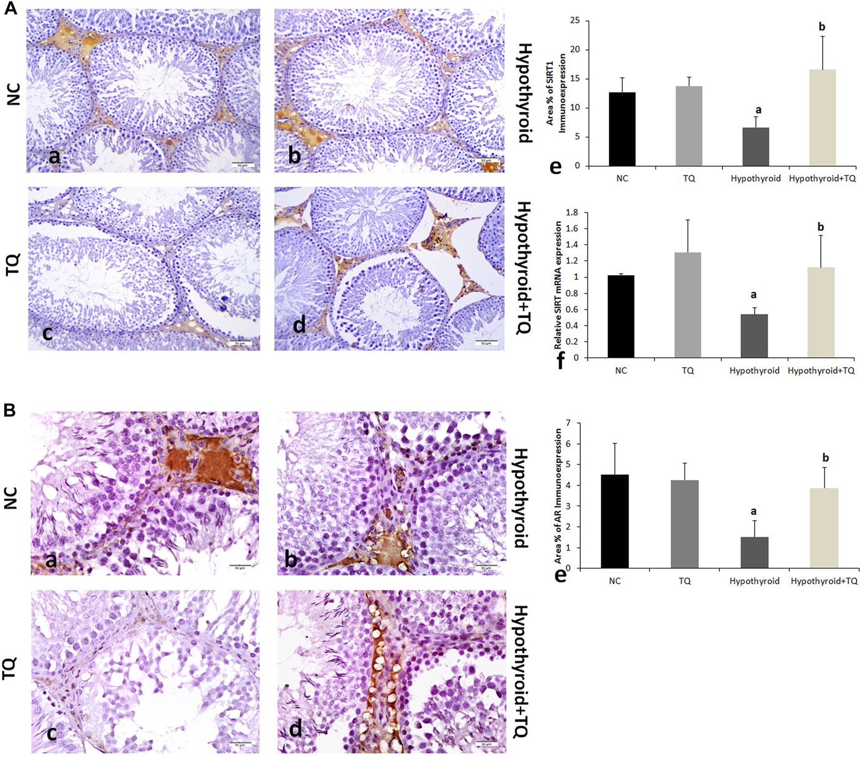 Materials and methods: Propylthiouracil (PTU) was used to induce hypothyroidism in adult male Wistar rats, who were then treated with TQ (50 mg/kg/body weight) for 4 weeks and compared to the untreated rats. Thyroid hormonal profile, oxidants/antioxidants profile, and serum testosterone levels were assessed. Gene expression and immune expression of SIRT1 and pro-inflammatory cytokines TNF-α and NF-κB were also assessed in the testicular tissue.